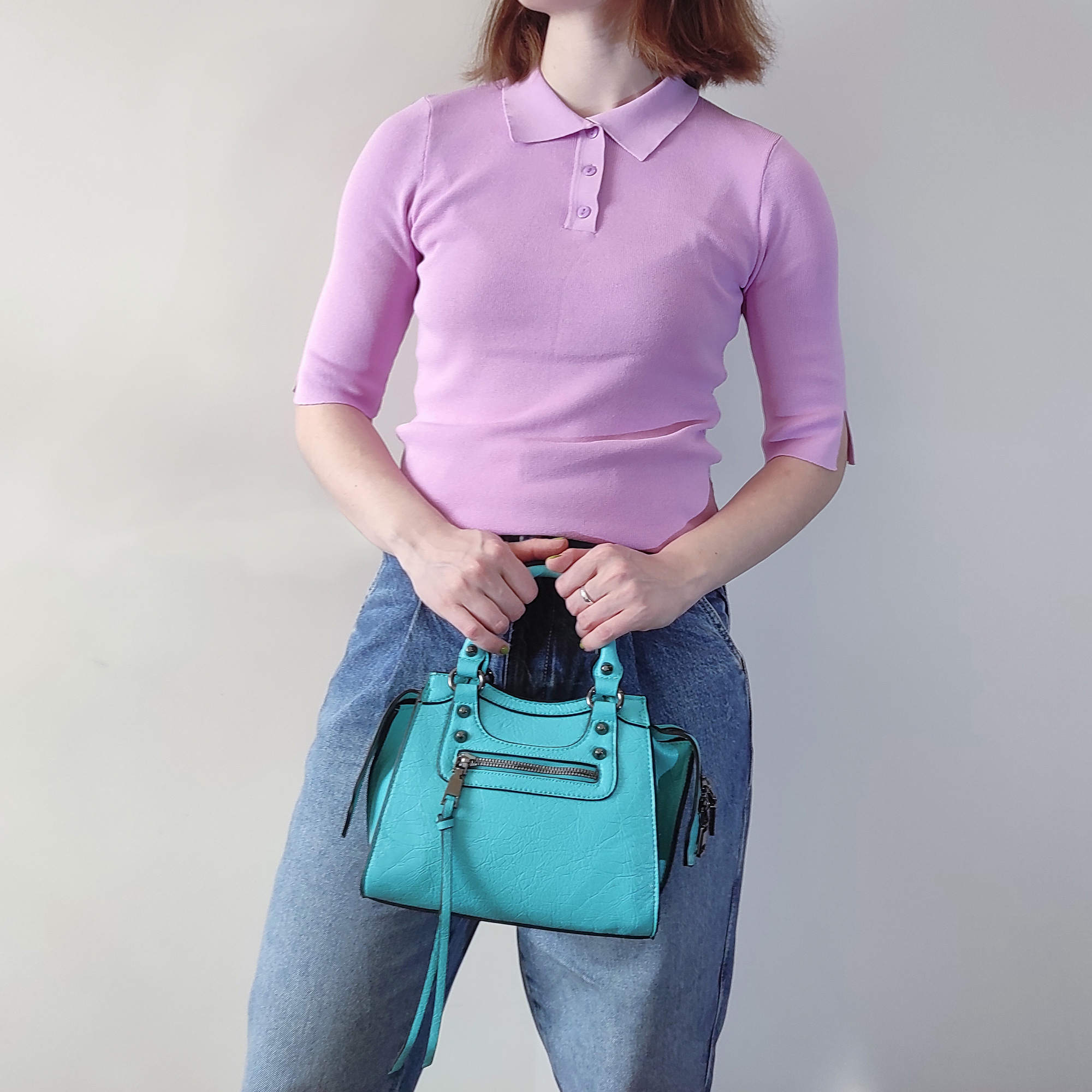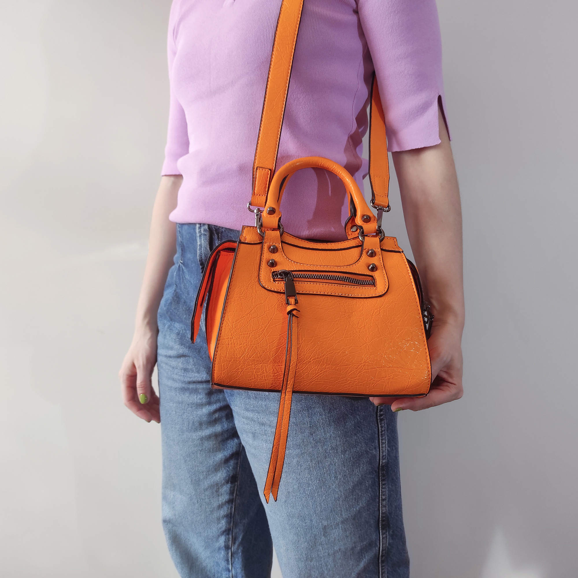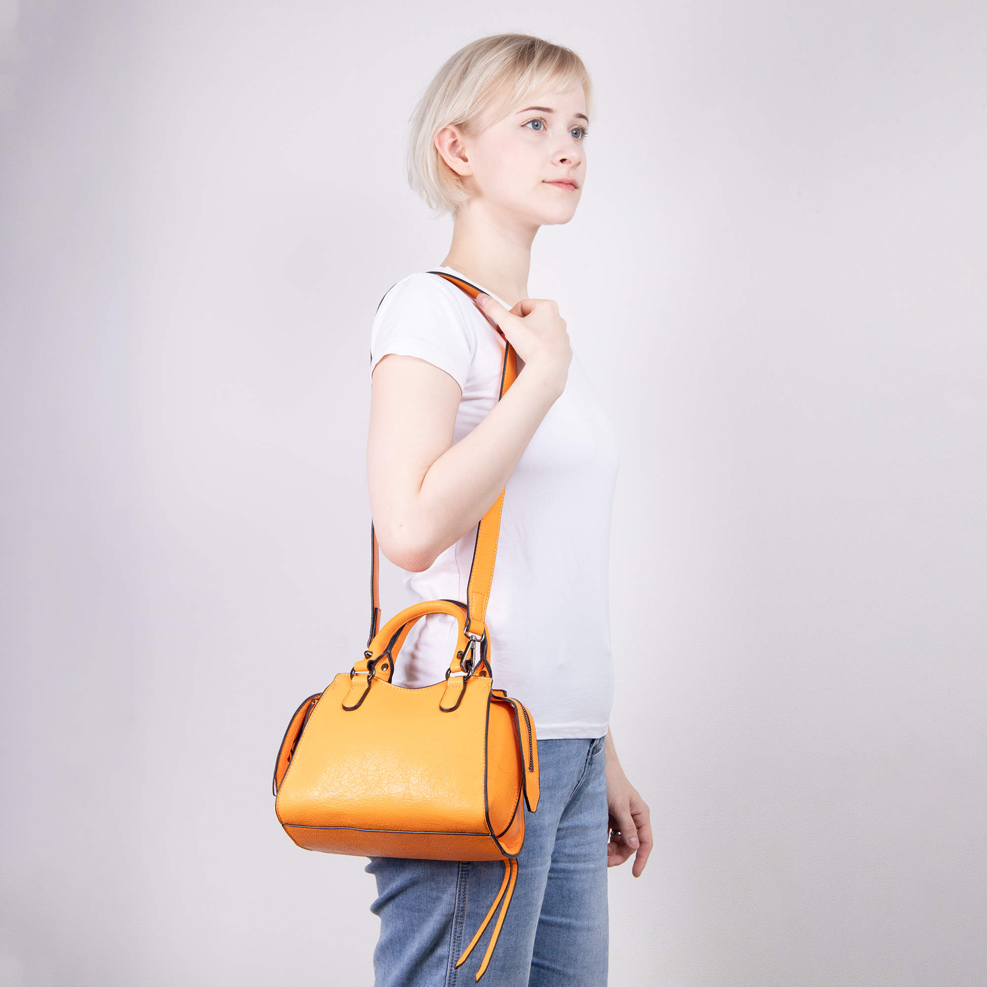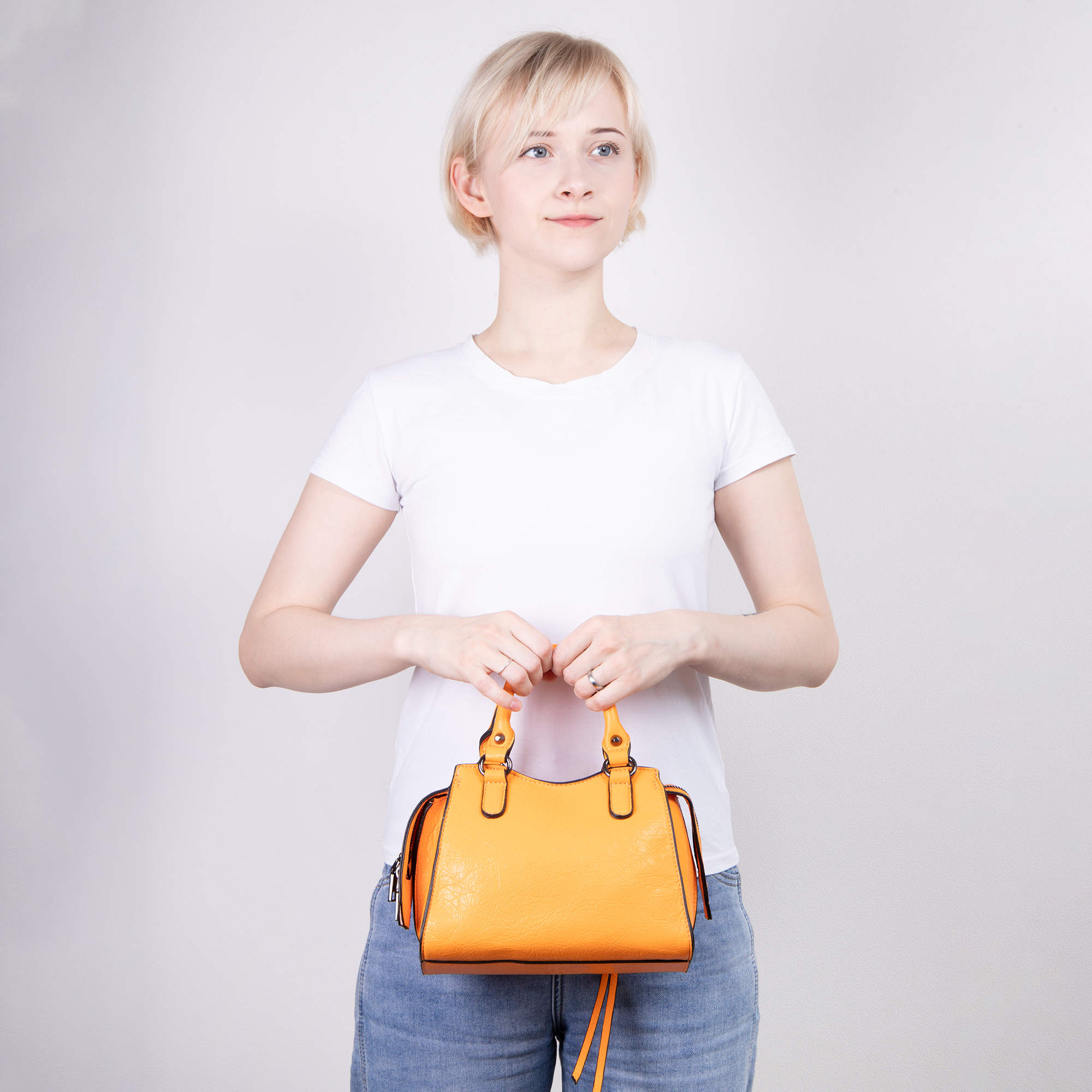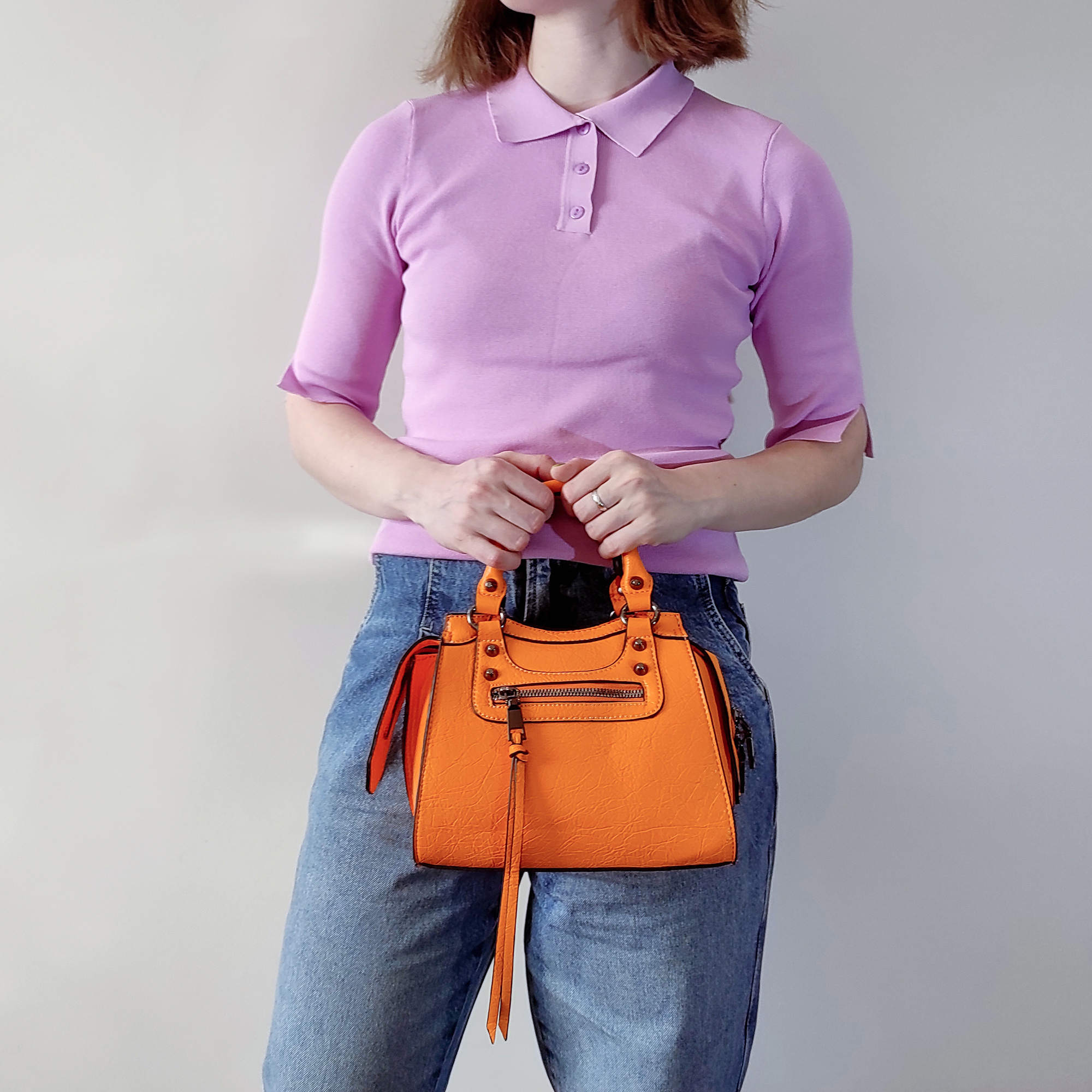 Стильная, яркая сумка фирмы Pola выполнена из экокожи и закрывается на металлическую молнию. Внутри основного отделения есть небольшой кармашек на молнии и один открытый карман для мелочей. Спереди модель украшена коротким ремешком и заклепками, есть накладной карман на молнии для ключей. Сумка прекрасно подойдёт женщинам, предпочитающим, яркий стиль. У сумки есть две ручки для переноски, высота которых 12 см и съёмный, нерегулируемый ремень, длина которого 96 см. Цвет фурнитуры-черный никель.