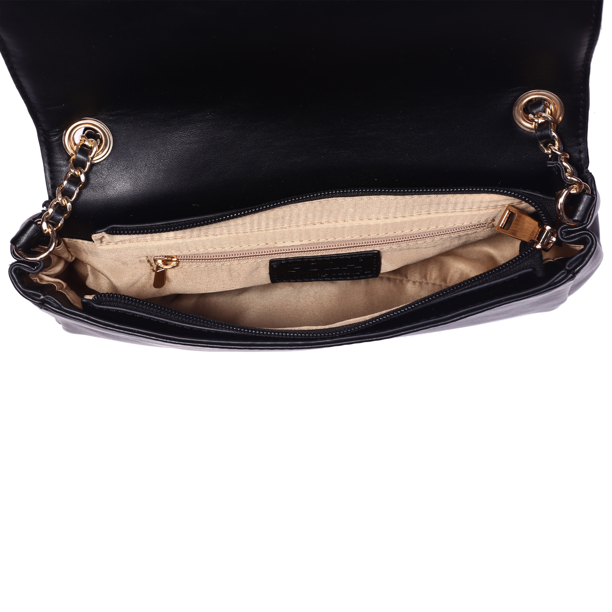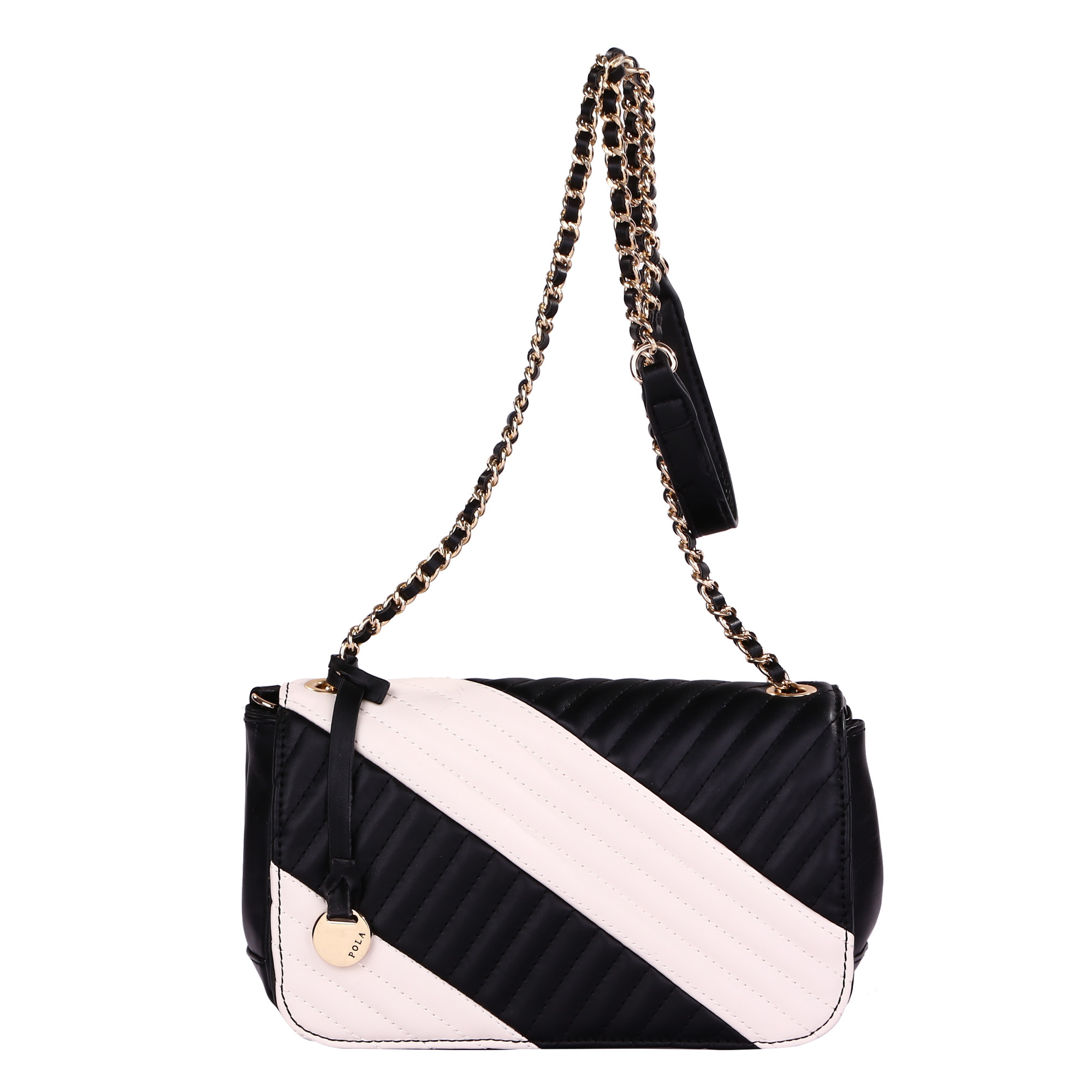 Женская сумка-клатч Pola выполнена из экокожи, сверху закрывается клапаном , украшенным разноцветными полосками. Основное отделение закрывается на молнию, внутри основного отделения есть маленький кармашек на молнии. Сумку можно носить как в руках, так и на плече. Длина несъёмного, нерегулируемого плечевого ремня-цепочки - 46см. Цвет фурнитуры - светлое золото.