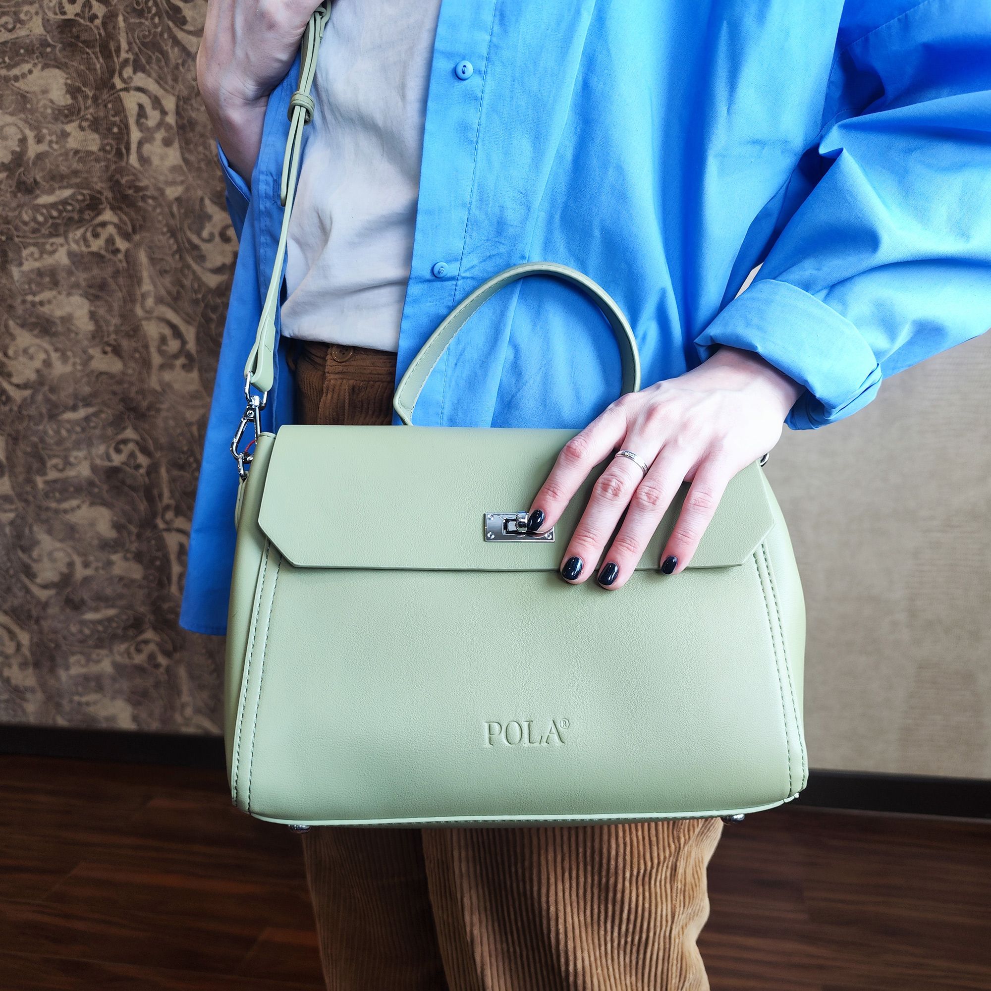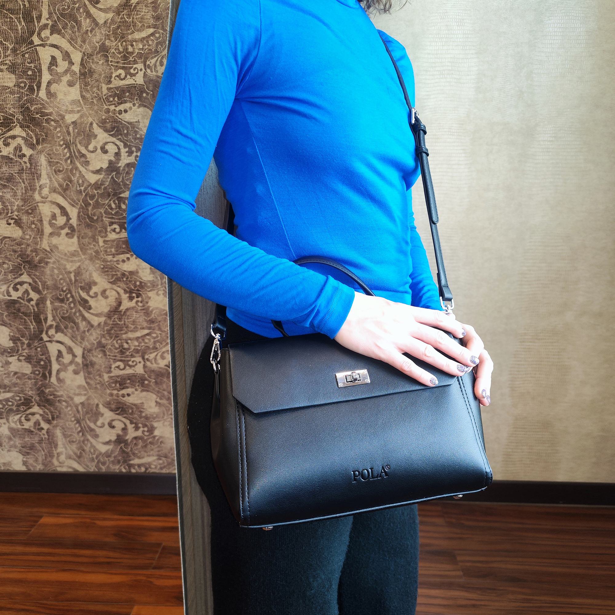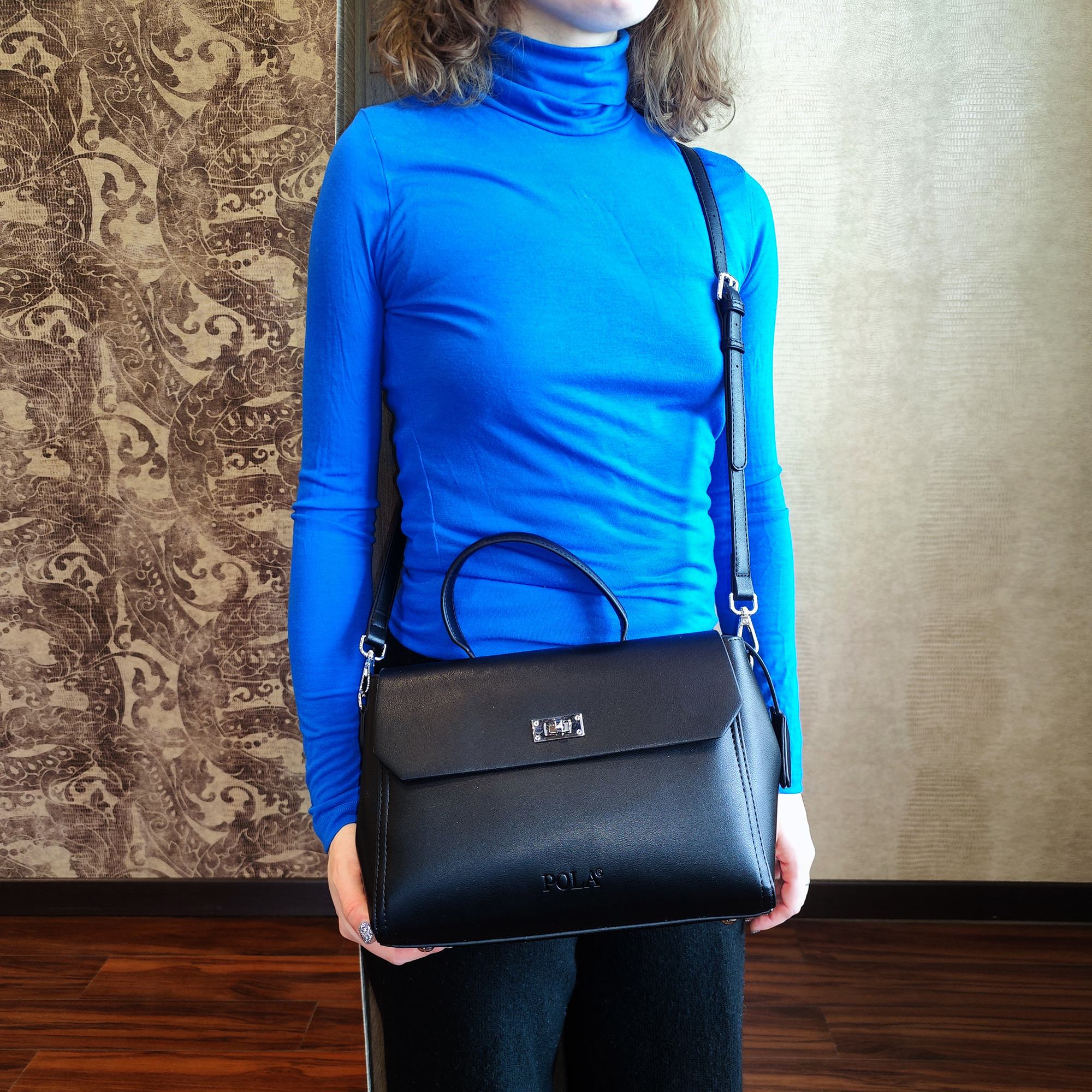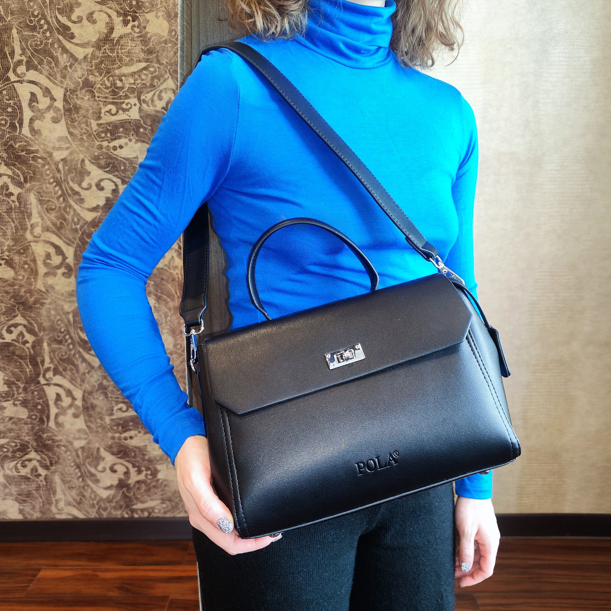Элегантная сумка Pola выполнена из экокожи. Сумка прекрасно подойдёт женщинам, которые предпочитают деловой стиль. Сумка состоит из одного основного отделения, которое закрывается клапаном на поворотный металлический замок. Внутри основного отделения есть кармашек на молнии и один открытый карман. Сзади сумки присутствует маленький карман на молнии. У сумки есть ручка для переноски, высота которой 9 см и два съемных ремешка, один тонкий 117 см и 77см второй ремешок шириной 3,5 см. Цвет фурнитуры-серебро.