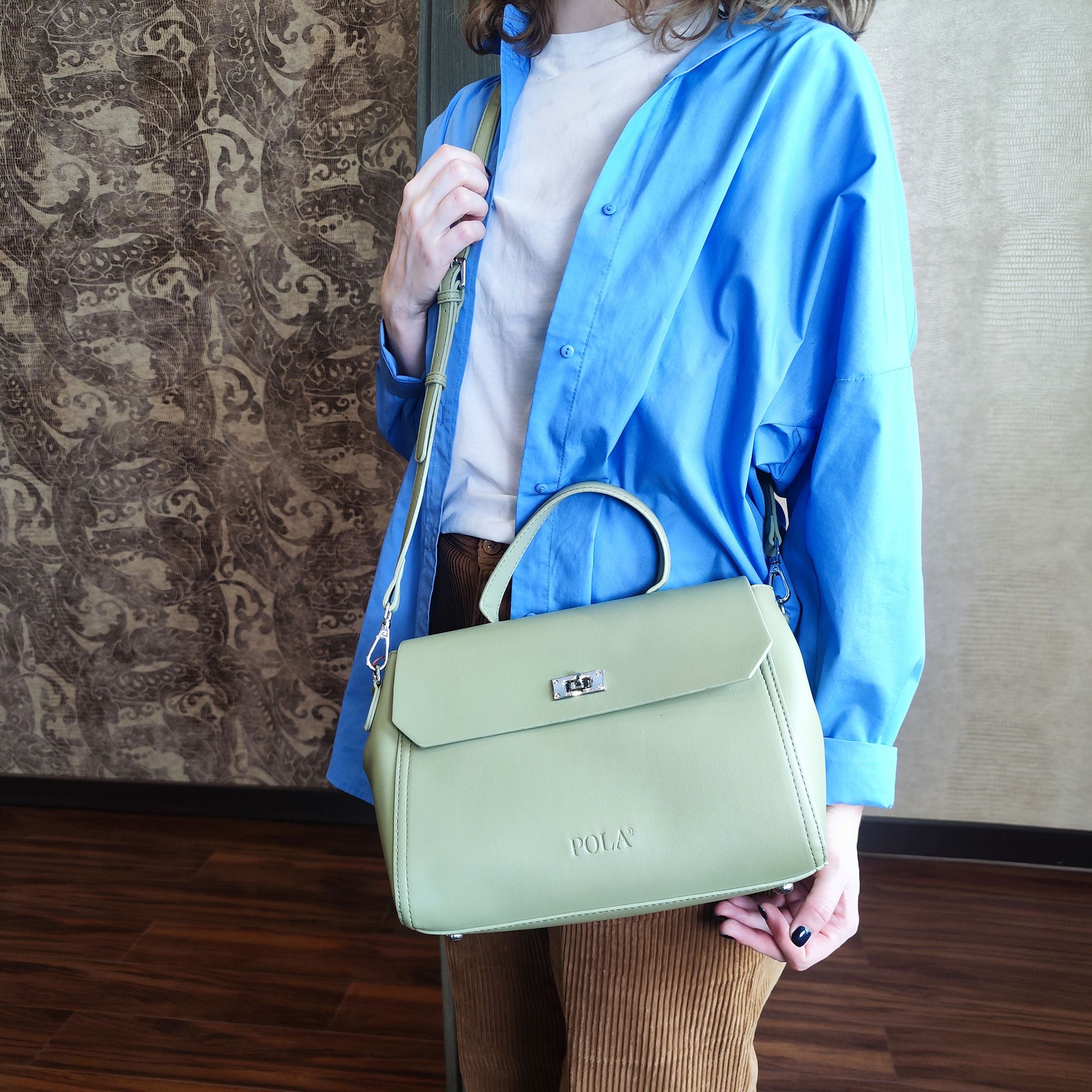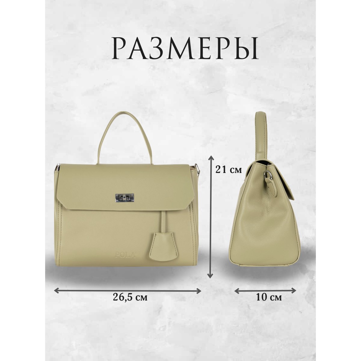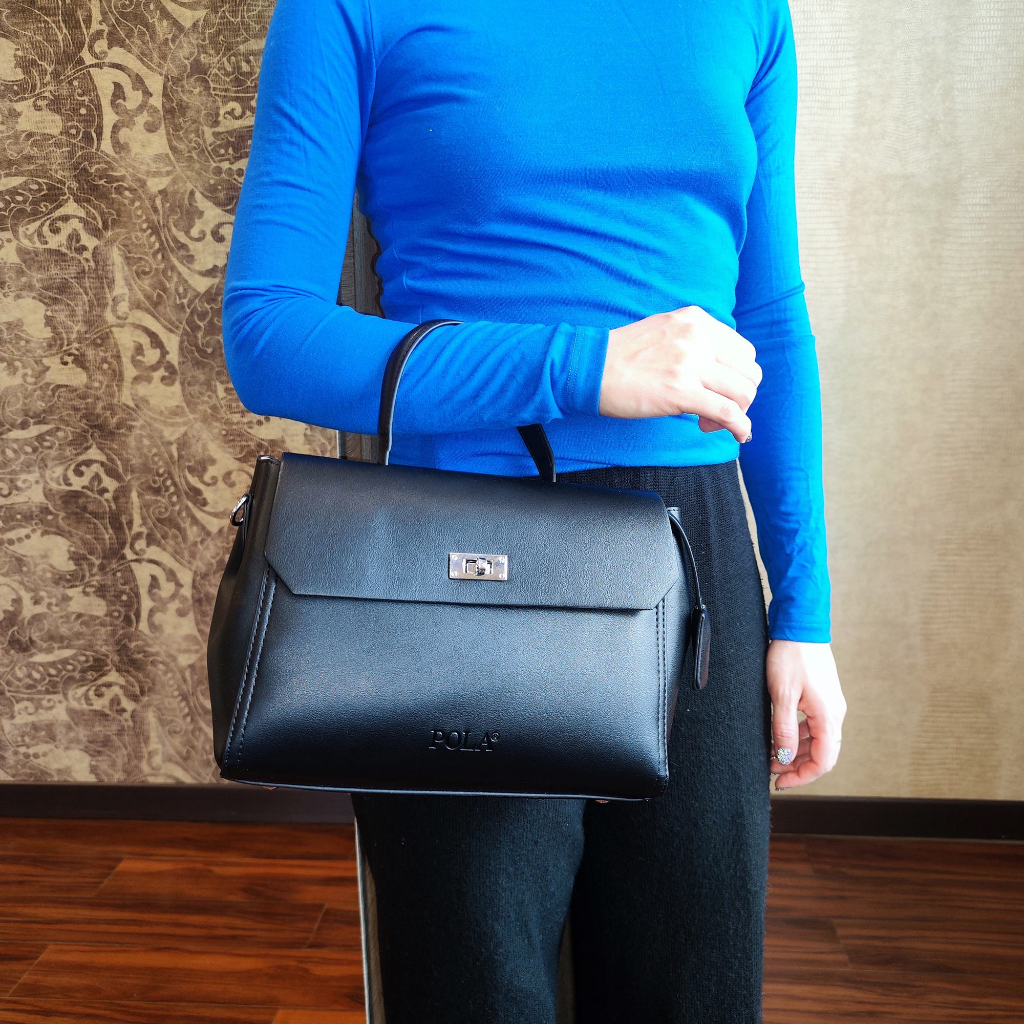 Элегантная сумка Pola выполнена из экокожи. Сумка прекрасно подойдёт женщинам, которые предпочитают деловой стиль. Сумка состоит из одного основного отделения, которое закрывается клапаном на поворотный металлический замок. Внутри основного отделения есть кармашек на молнии и один открытый карман. Сзади сумки присутствует маленький карман на молнии. У сумки есть ручка для переноски, высота которой 9 см и два съемных ремешка, один тонкий 117 см и 77см второй ремешок шириной 3,5 см. Цвет фурнитуры-серебро.