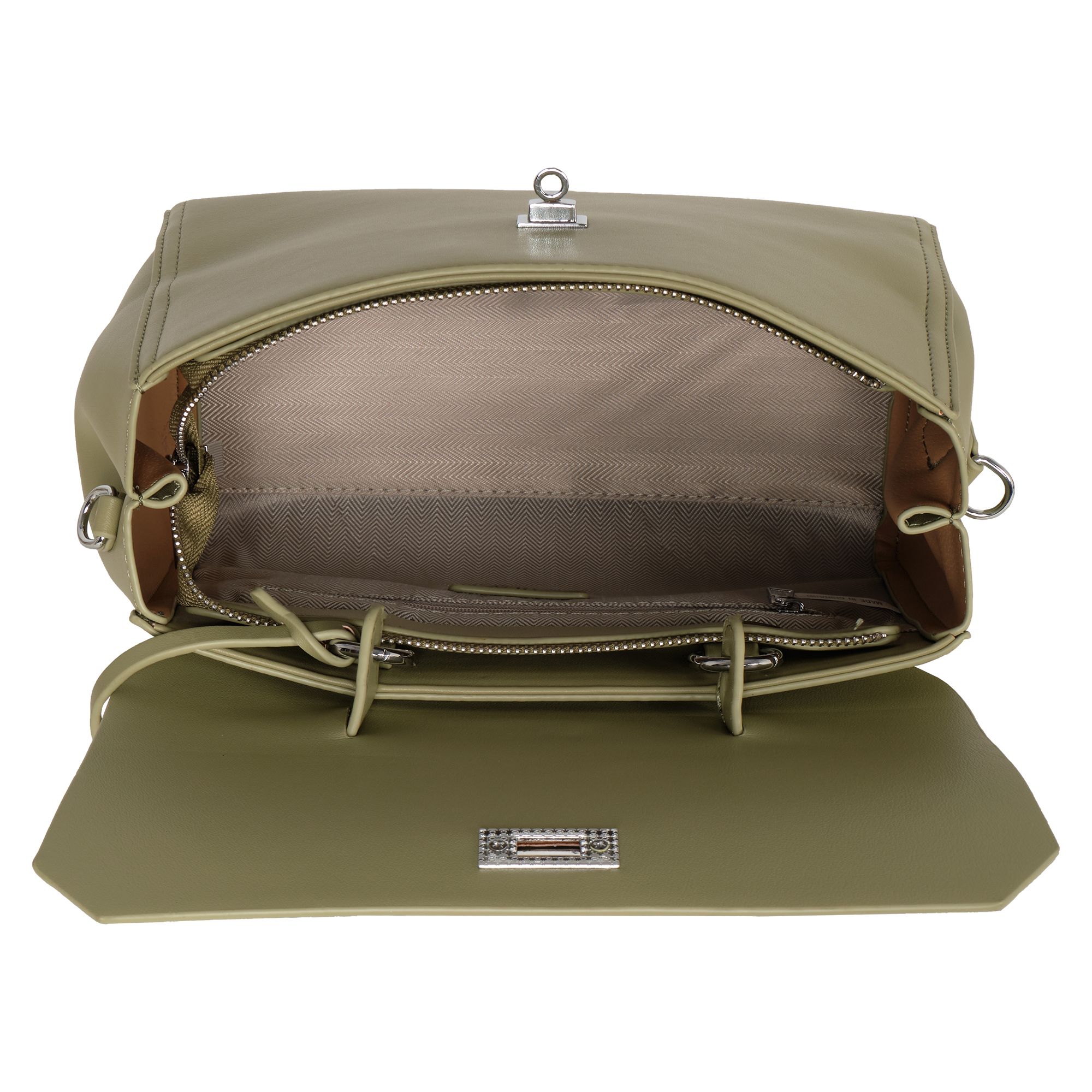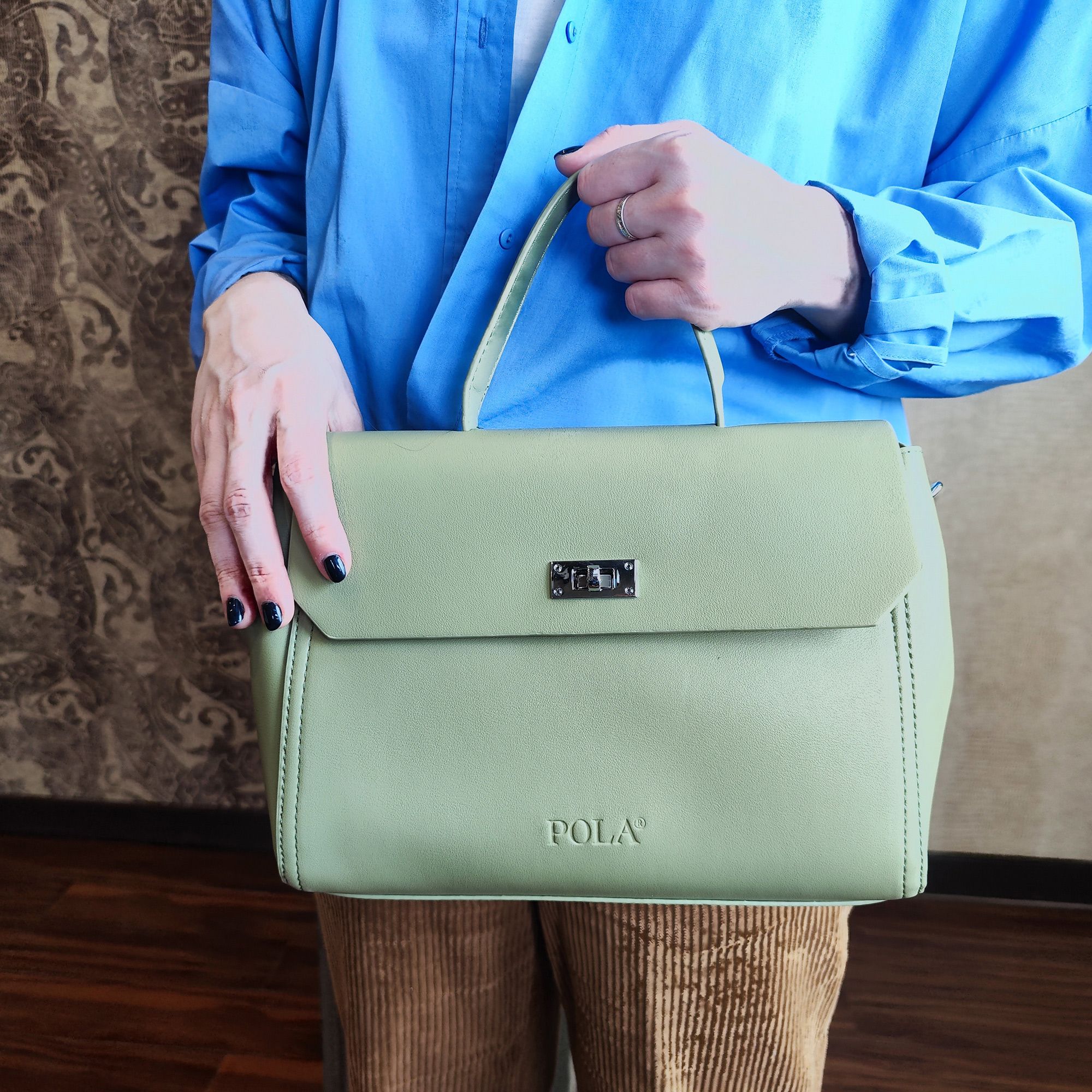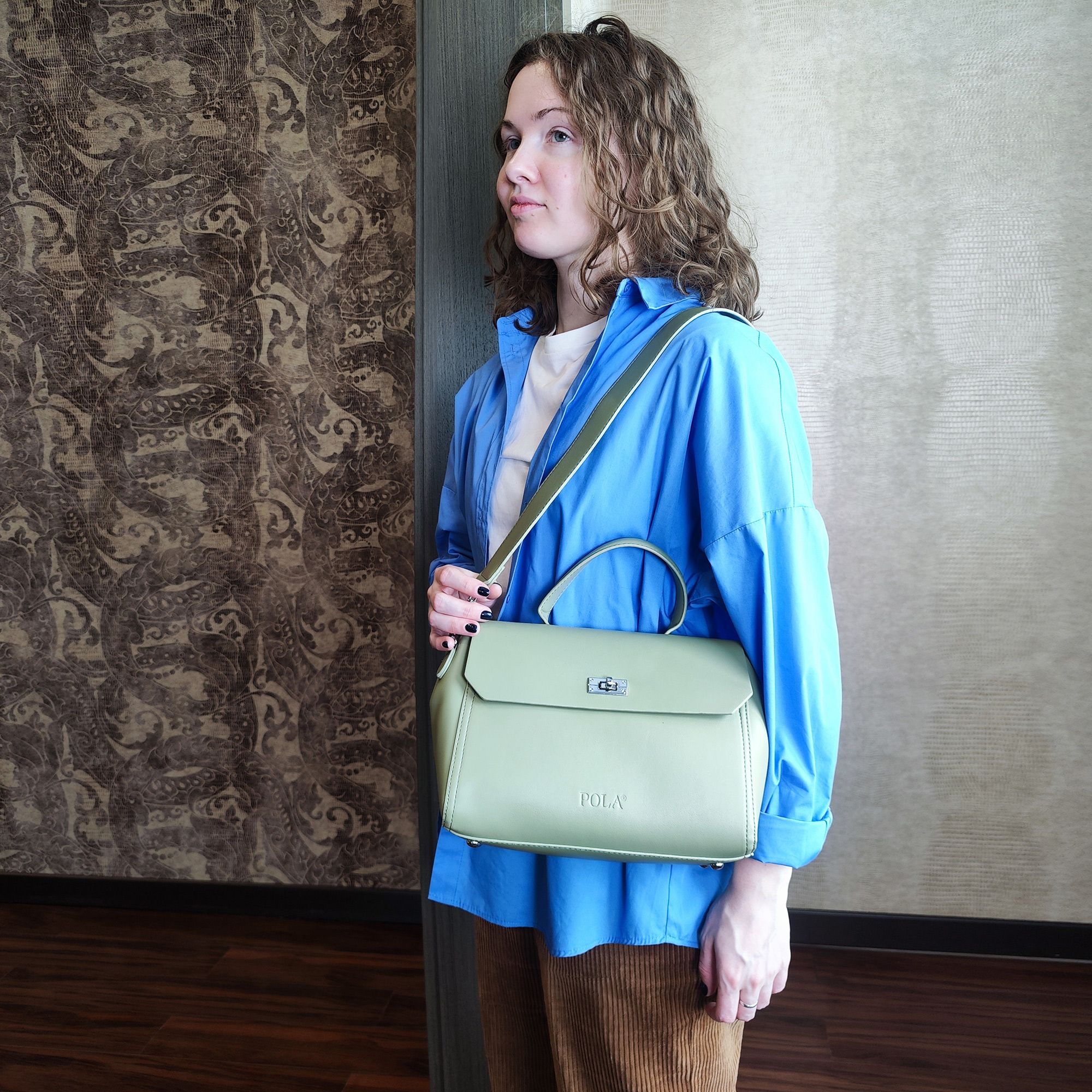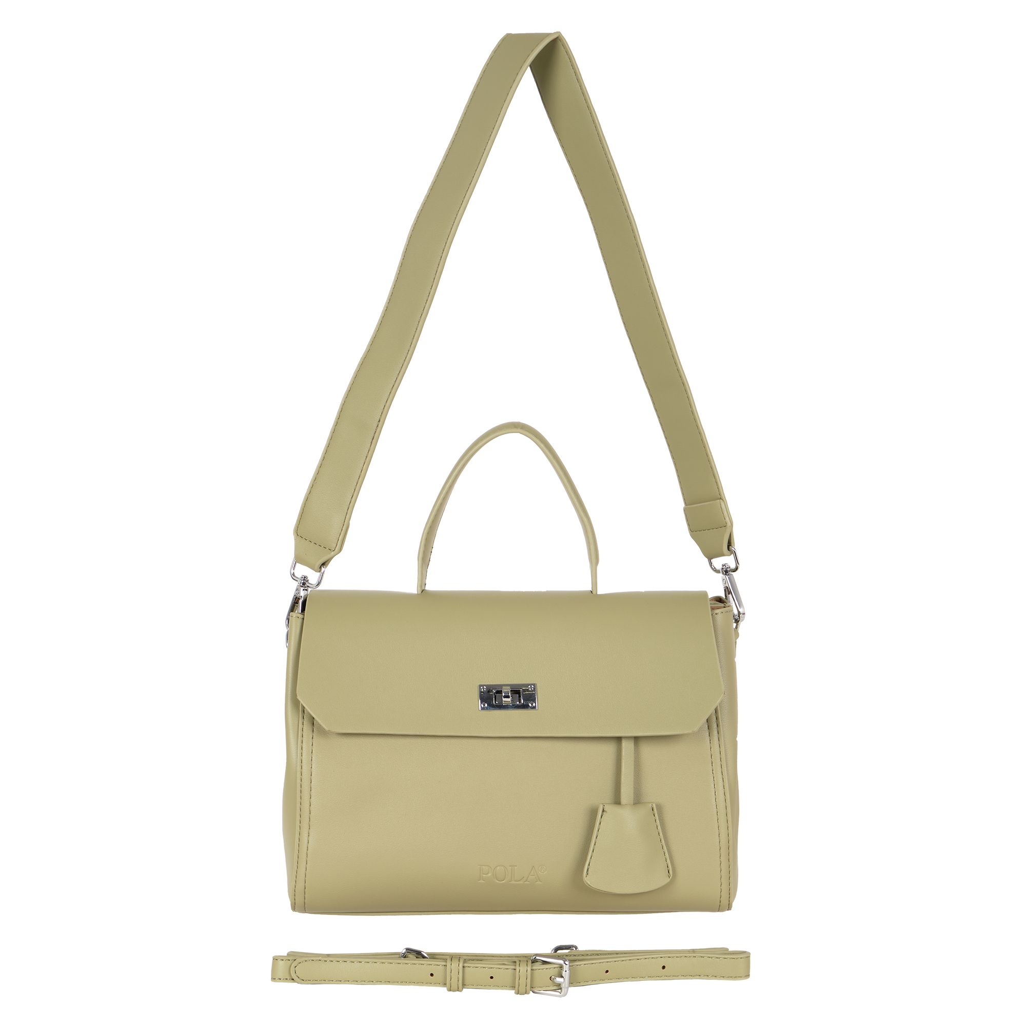 Элегантная сумка Pola выполнена из экокожи. Сумка прекрасно подойдёт женщинам, которые предпочитают деловой стиль. Сумка состоит из одного основного отделения, которое закрывается клапаном на поворотный металлический замок. Внутри основного отделения есть кармашек на молнии и один открытый карман. Сзади сумки присутствует маленький карман на молнии. У сумки есть ручка для переноски, высота которой 9 см и два съемных ремешка, один тонкий 117 см и 77см второй ремешок шириной 3,5 см. Цвет фурнитуры-серебро.