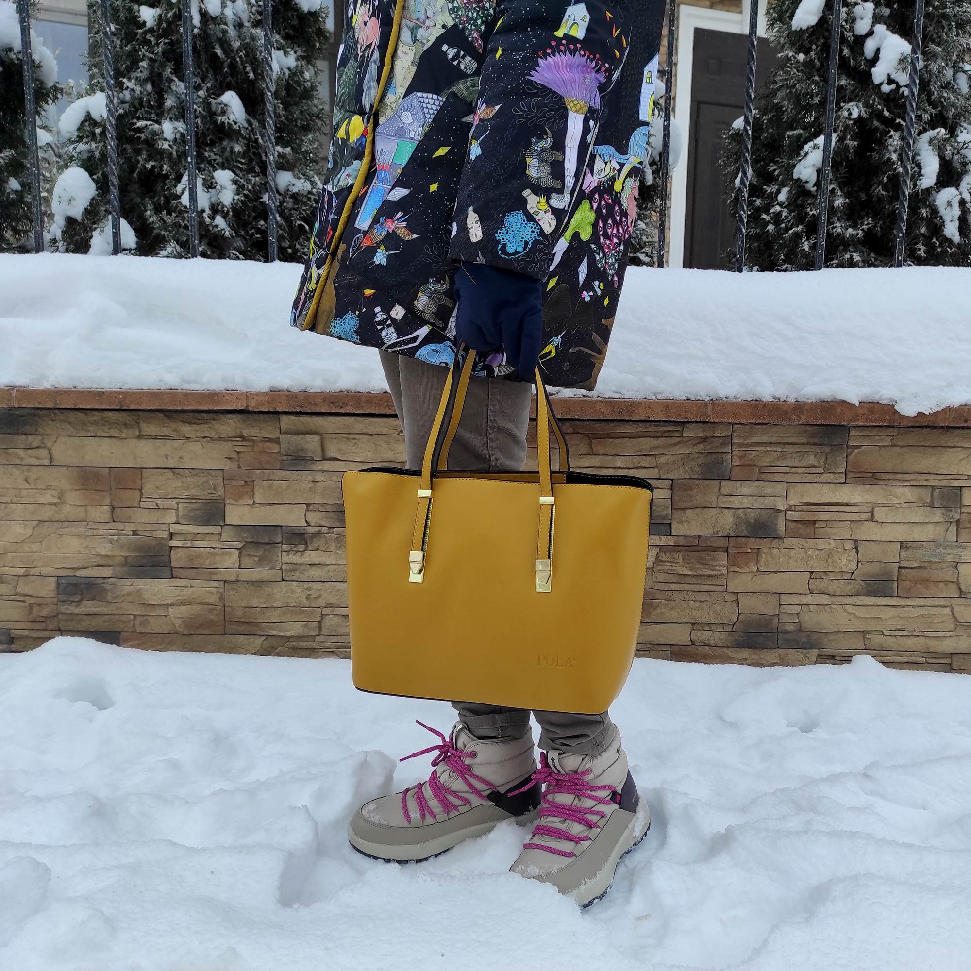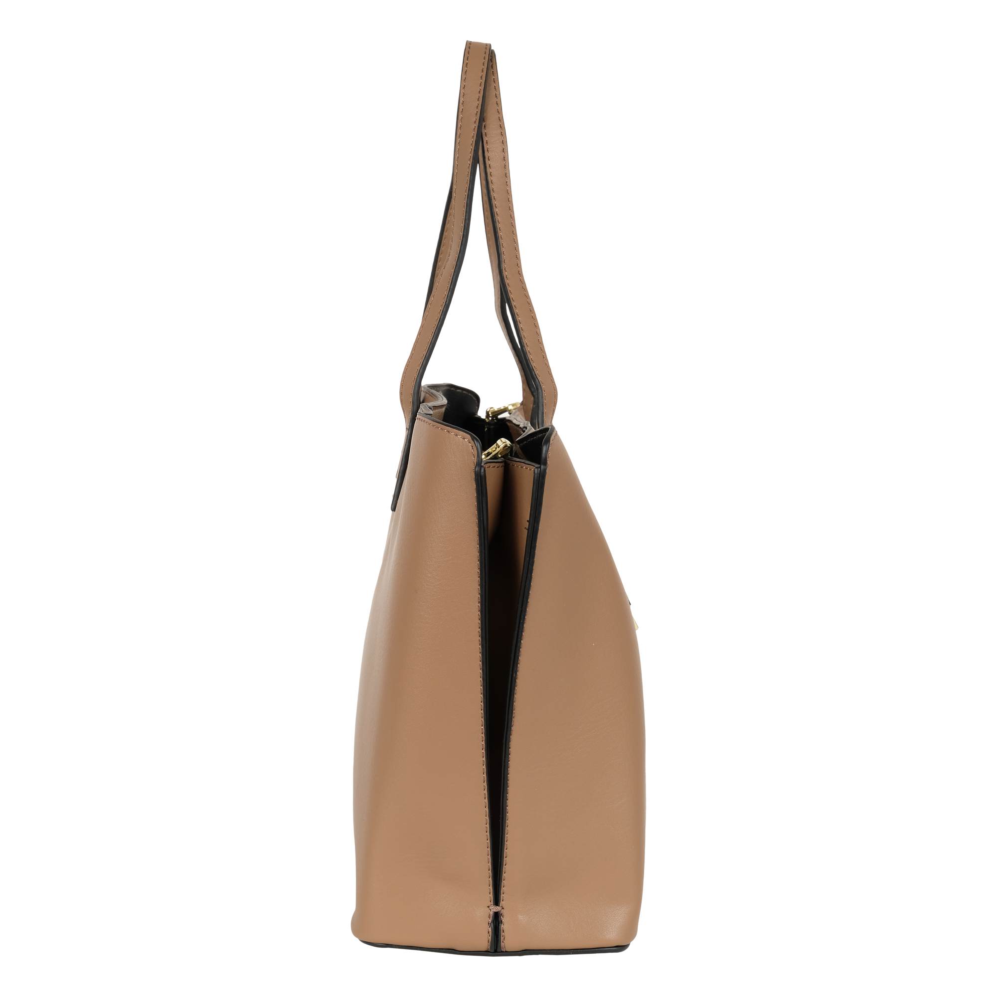 Стильная женская сумка-тоут с двумя ручками для переноски фирмы Pola выполнена из экокожи и предназначена для повседневного использования. Основное отделение закрывается на металлическую молнию и разделено кармашком на молнии на два отделения. Внутри сумочки есть маленький карман на молнии и два открытых. Отличительной особенностью данной модели является наличие с двух сторон боковых отделений в виде карманов на магнитной кнопке.  У сумки есть ручки для переноски, высота которых составляет 17 см и два съёмных, ремешка, один из экокожи тонкий регулируемый длина которого- 123 см и 90 см второй ремешок из текстиля. Цвет фурнитуры-золото.