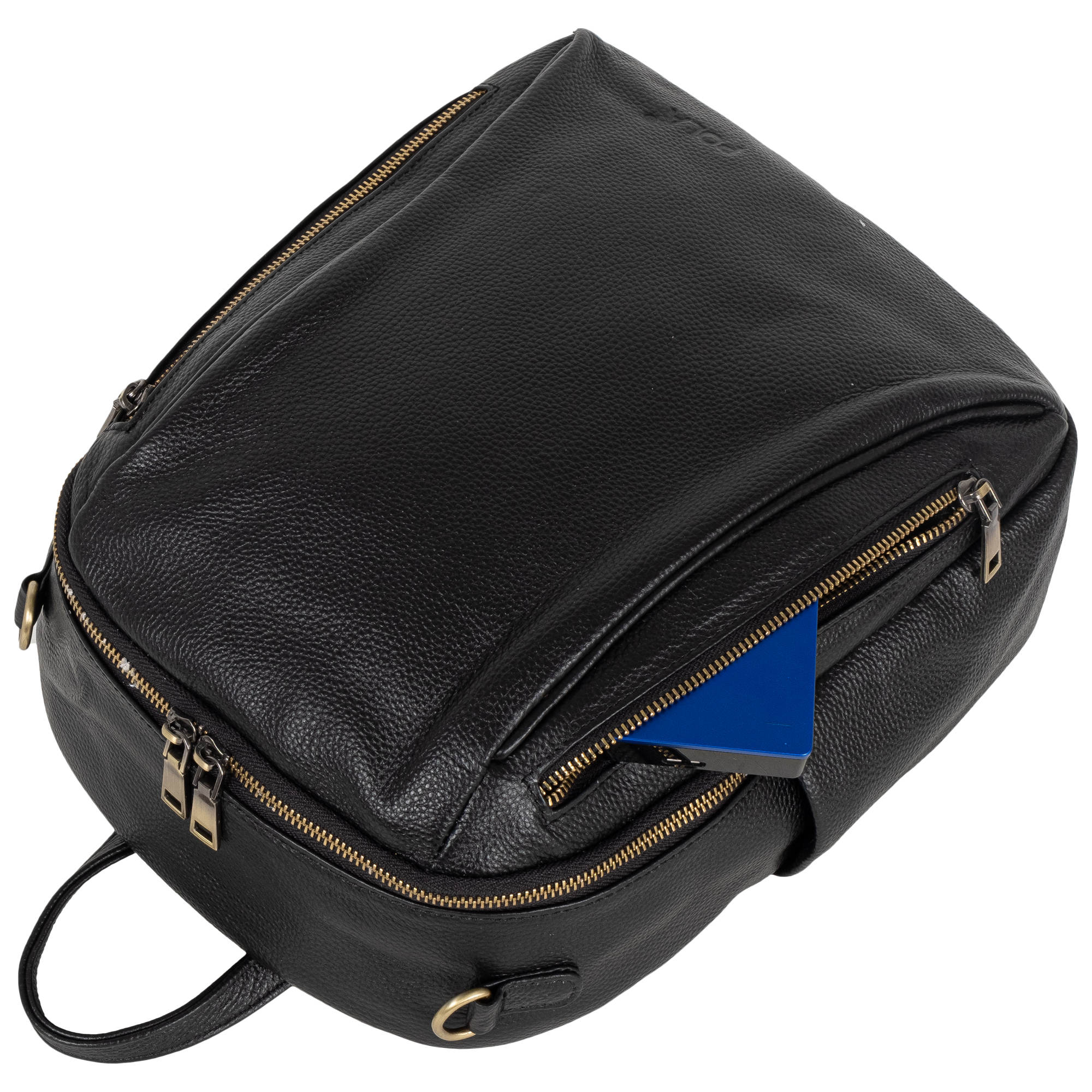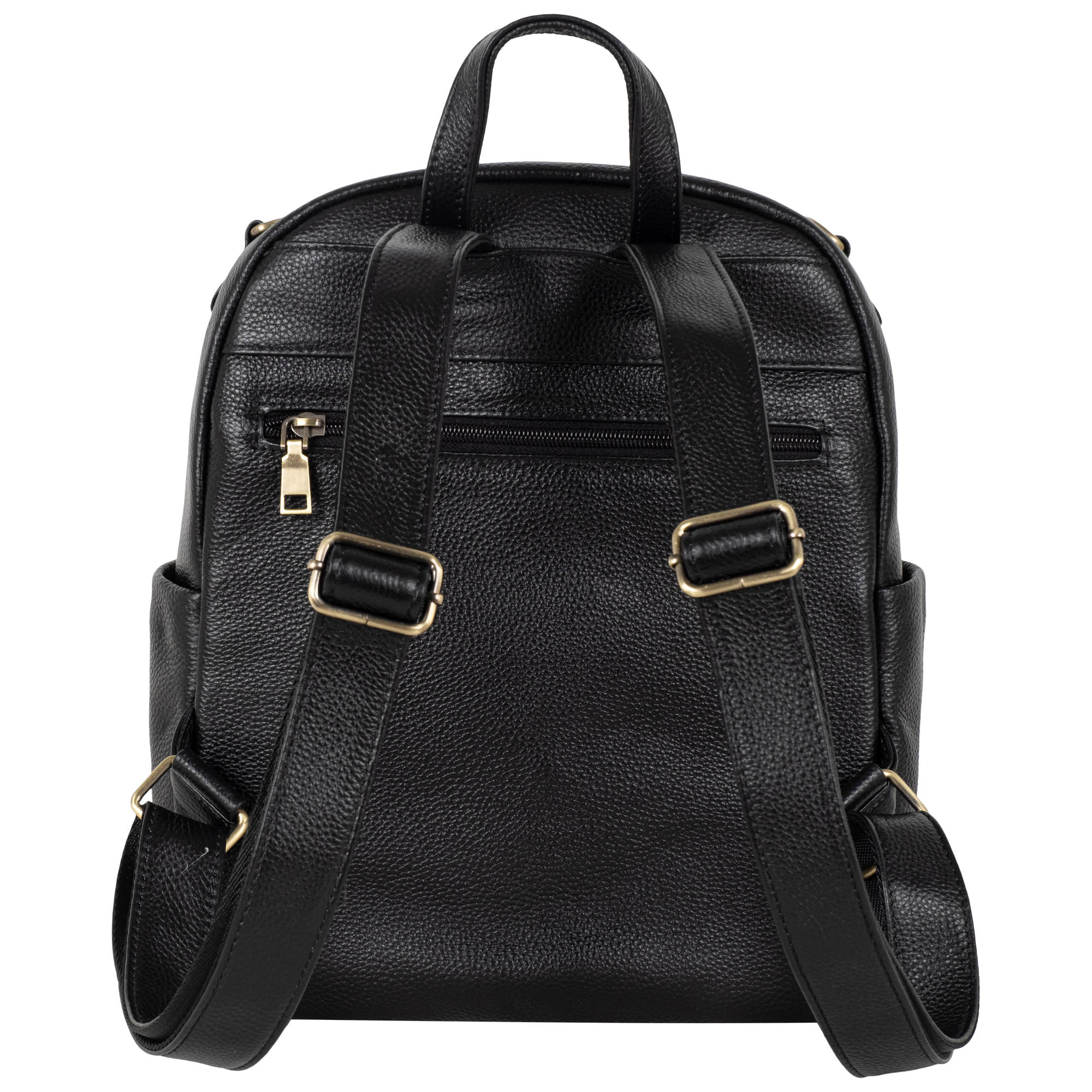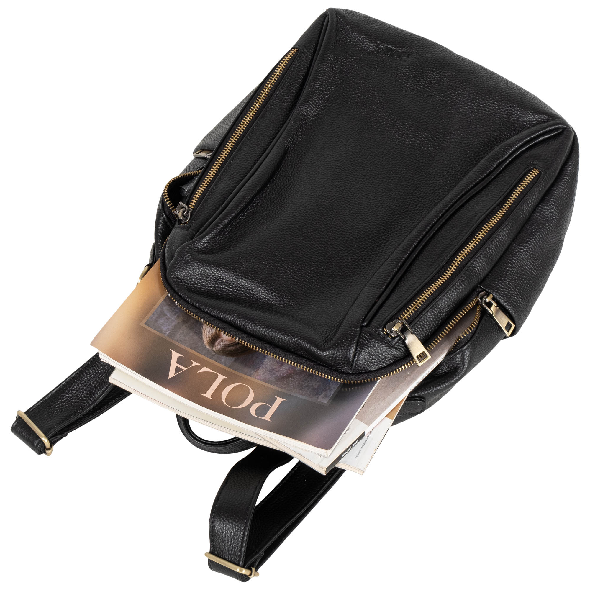 Стильный рюкзак Pola выполнен из прочной зерненой кожи. Основное отделение застегивается золотистой молнией. В рюкзак поместятся смартфон, кошелек и ключи. Внутри в основном отделении два кармана на молнии по задней стенке и два открытый по передней. Спереди два кармана на молнии, по бокам два небольших открытых кармашка. Сзади карман на молнии. Отлично подойдет для повседневного использования. Длина лямок 90см. Цвет фурнитуры- золото.