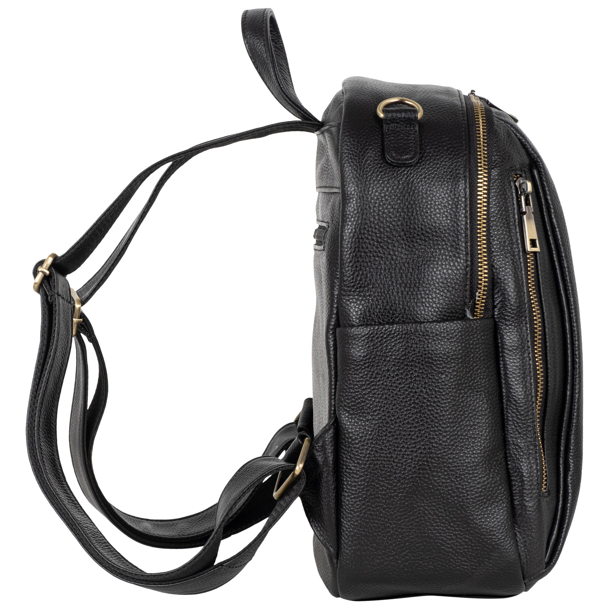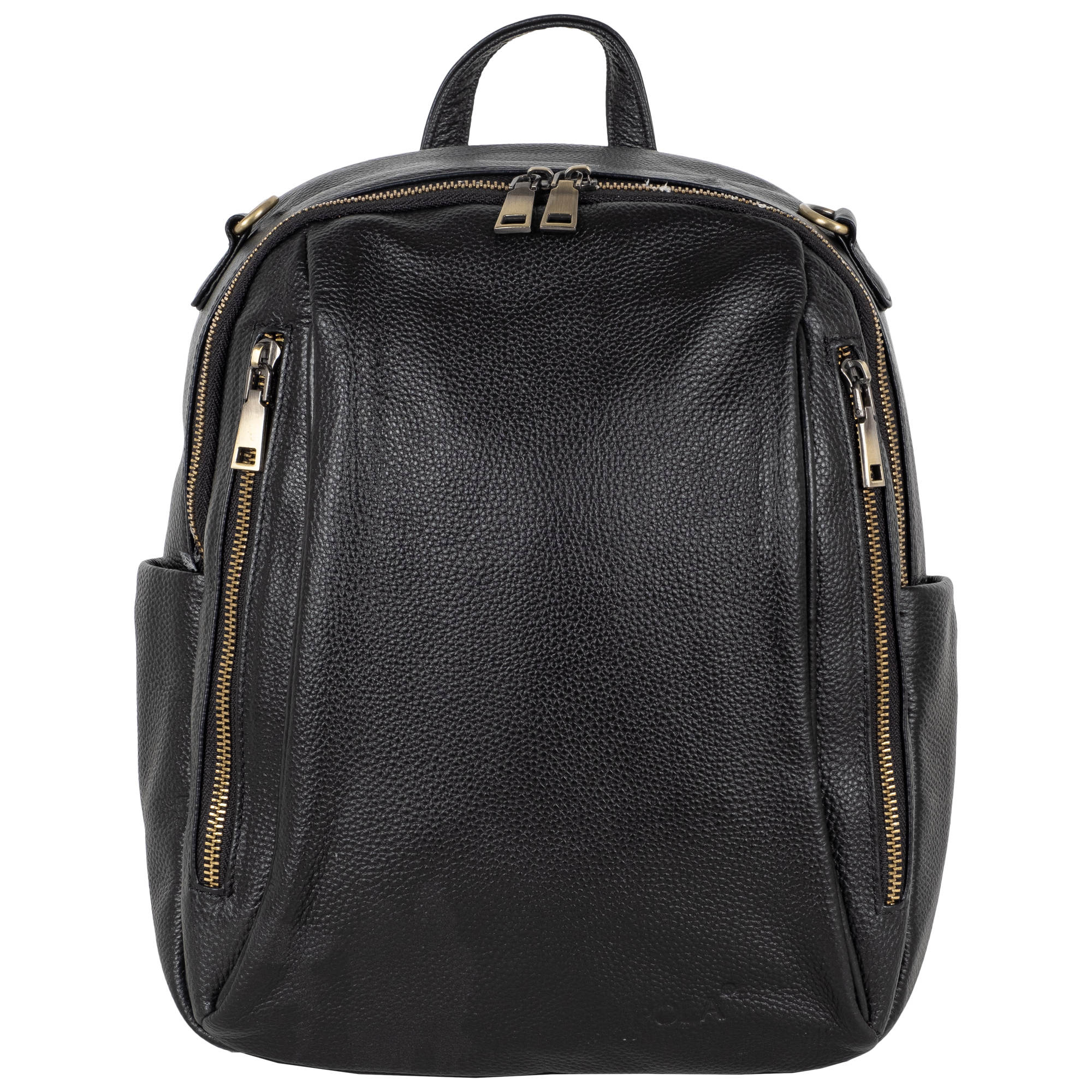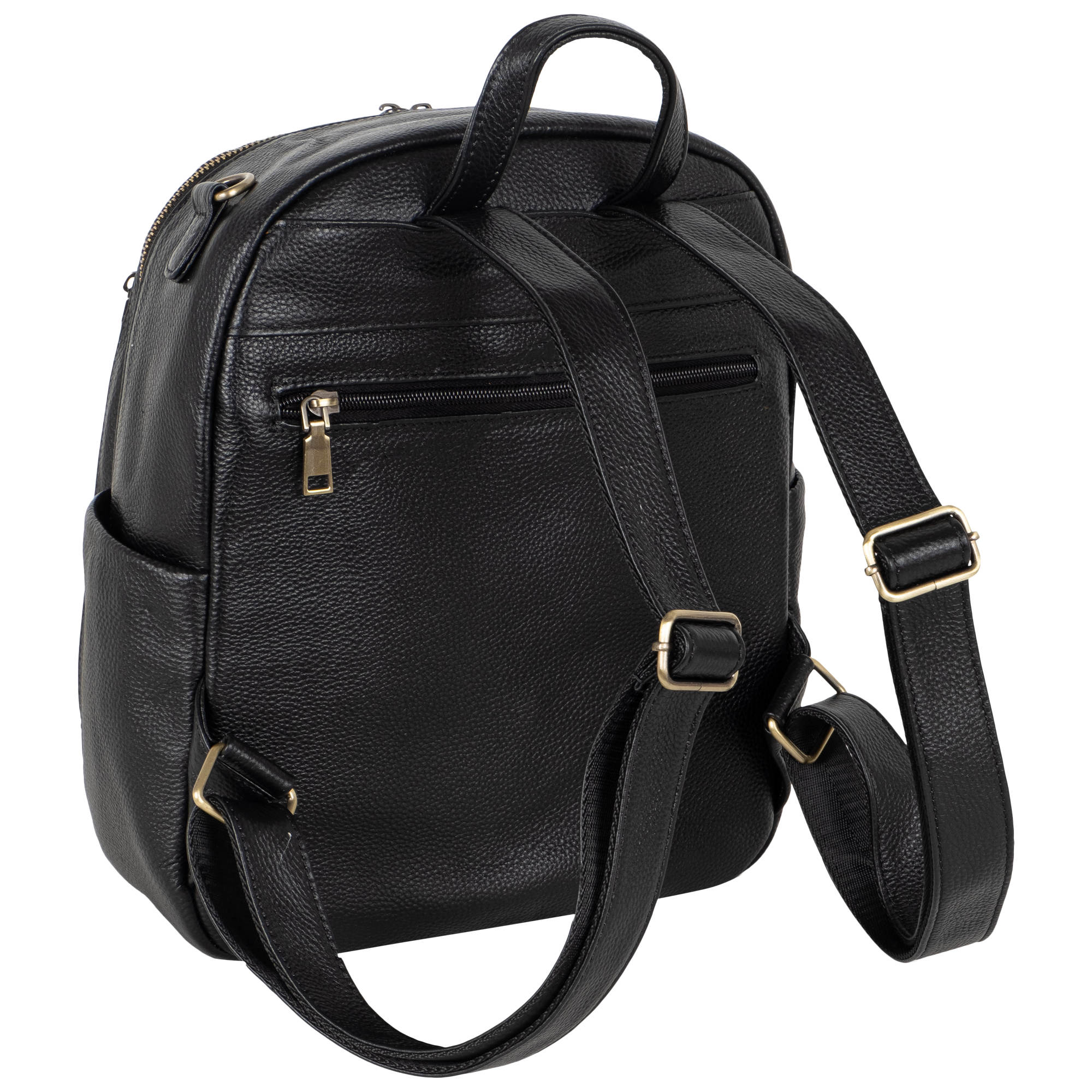 Стильный рюкзак Pola выполнен из прочной зерненой кожи. Основное отделение застегивается золотистой молнией. В рюкзак поместятся смартфон, кошелек и ключи. Внутри в основном отделении два кармана на молнии по задней стенке и два открытый по передней. Спереди два кармана на молнии, по бокам два небольших открытых кармашка. Сзади карман на молнии. Отлично подойдет для повседневного использования. Длина лямок 90см. Цвет фурнитуры- золото.