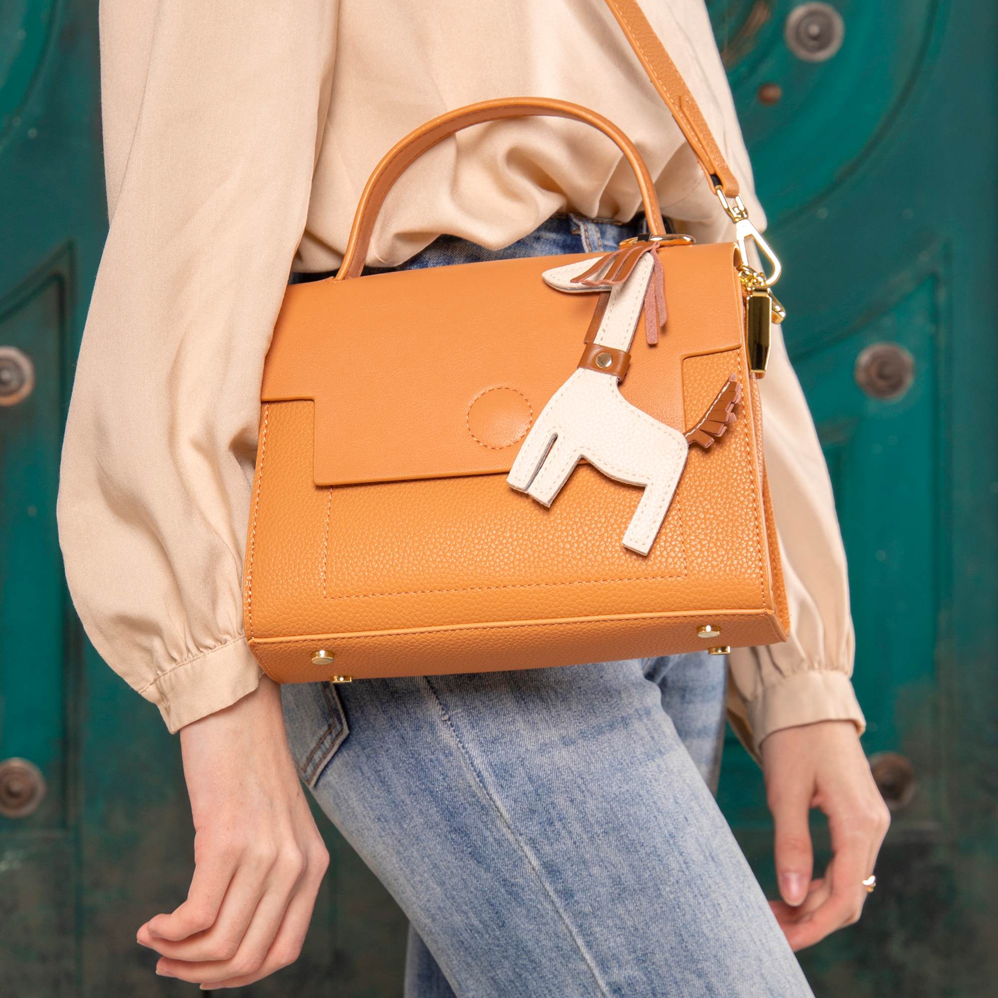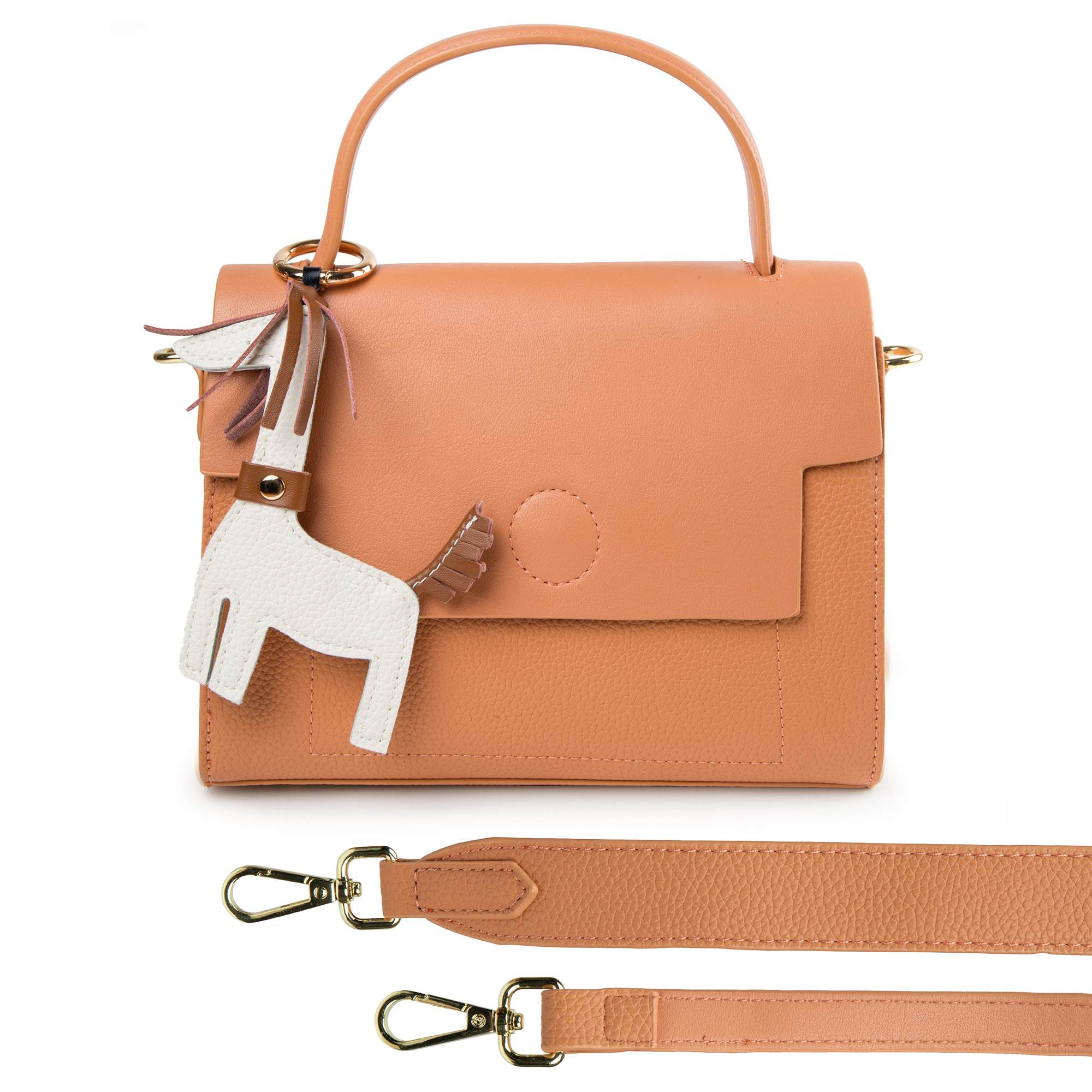 Стильная сумка фирмы Pola выполнена из экокожи со съемным брелком ламы и является прекрасным аксессуаром. Основное отделение на молнии, сверху закрывается на металлическую магнитную кнопку. Внутри один карман на молнии и один открытый кармашек. Сзади сумки карман на молнии. У сумки есть ручка для переноски, высота которой составляет 9 см и два съёмных ремешка, тонкий регулируемый ремешок длина которого- 115см, и длина второго 93см, что позволяет носить сумку на плече. Цвет фурнитуры-золото.