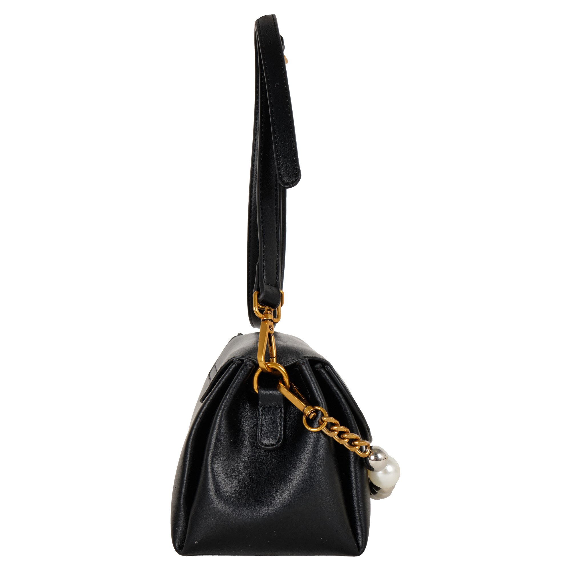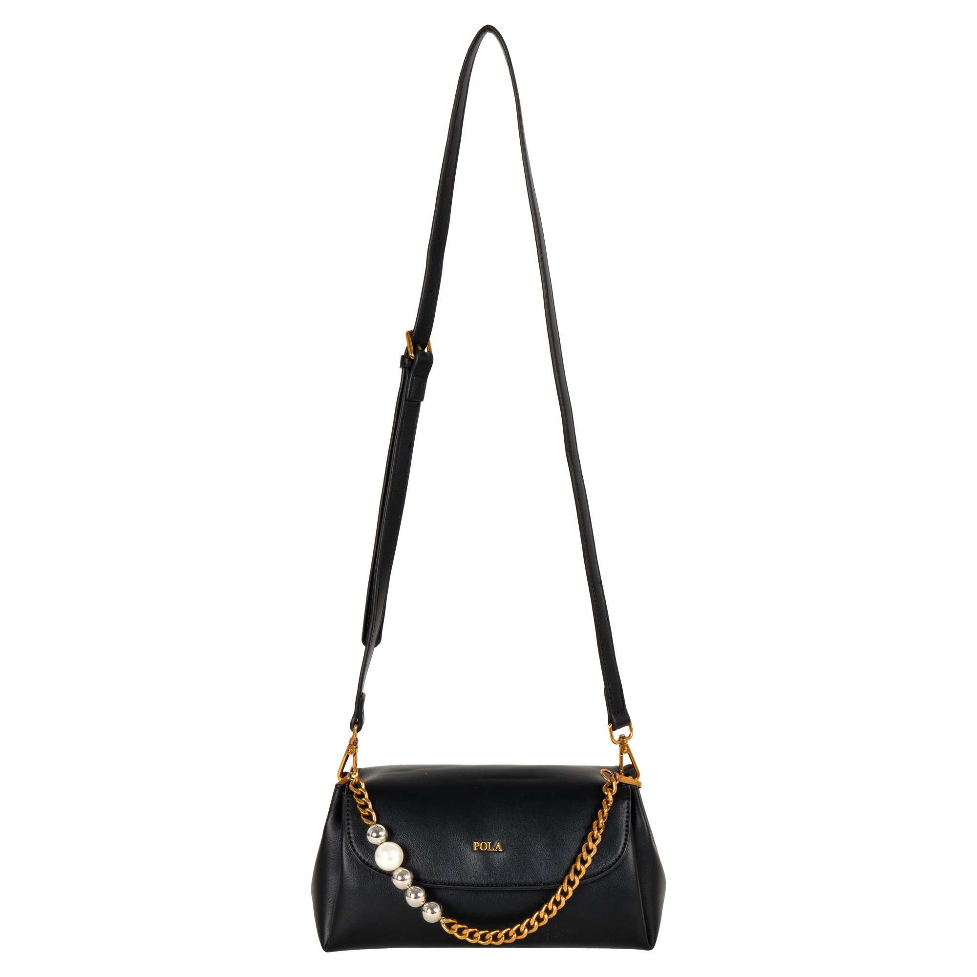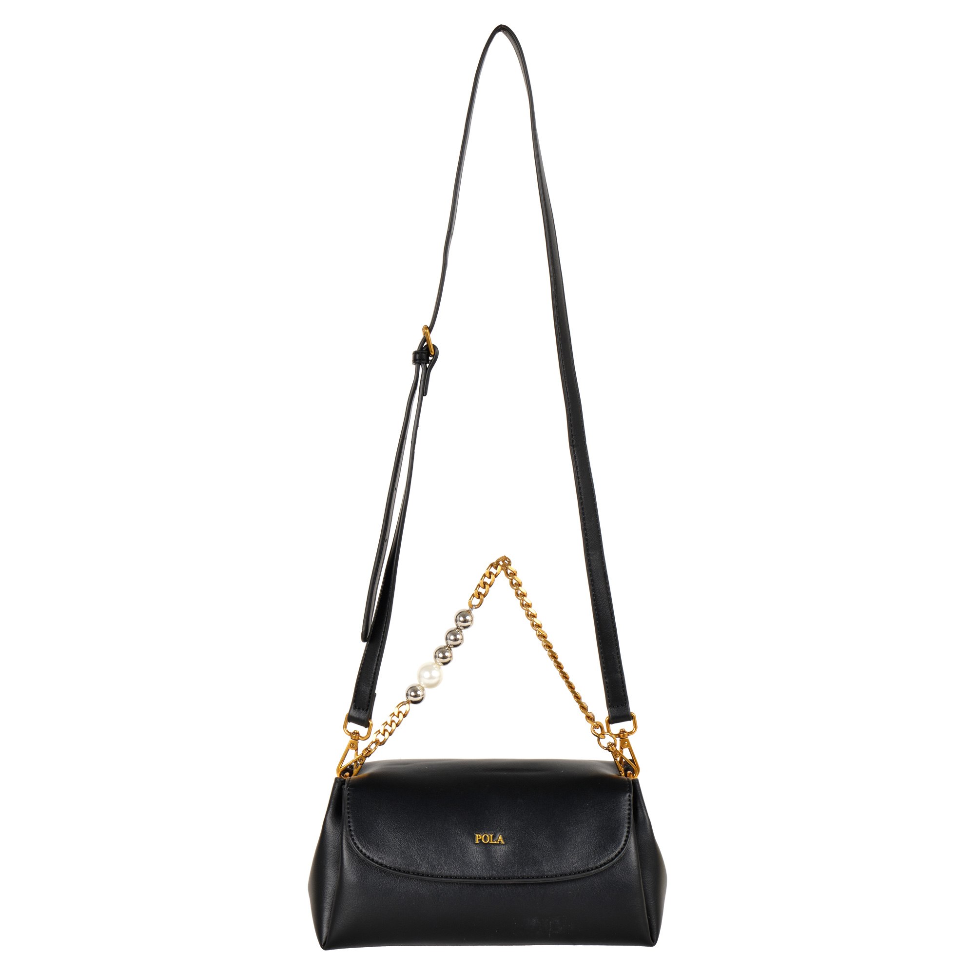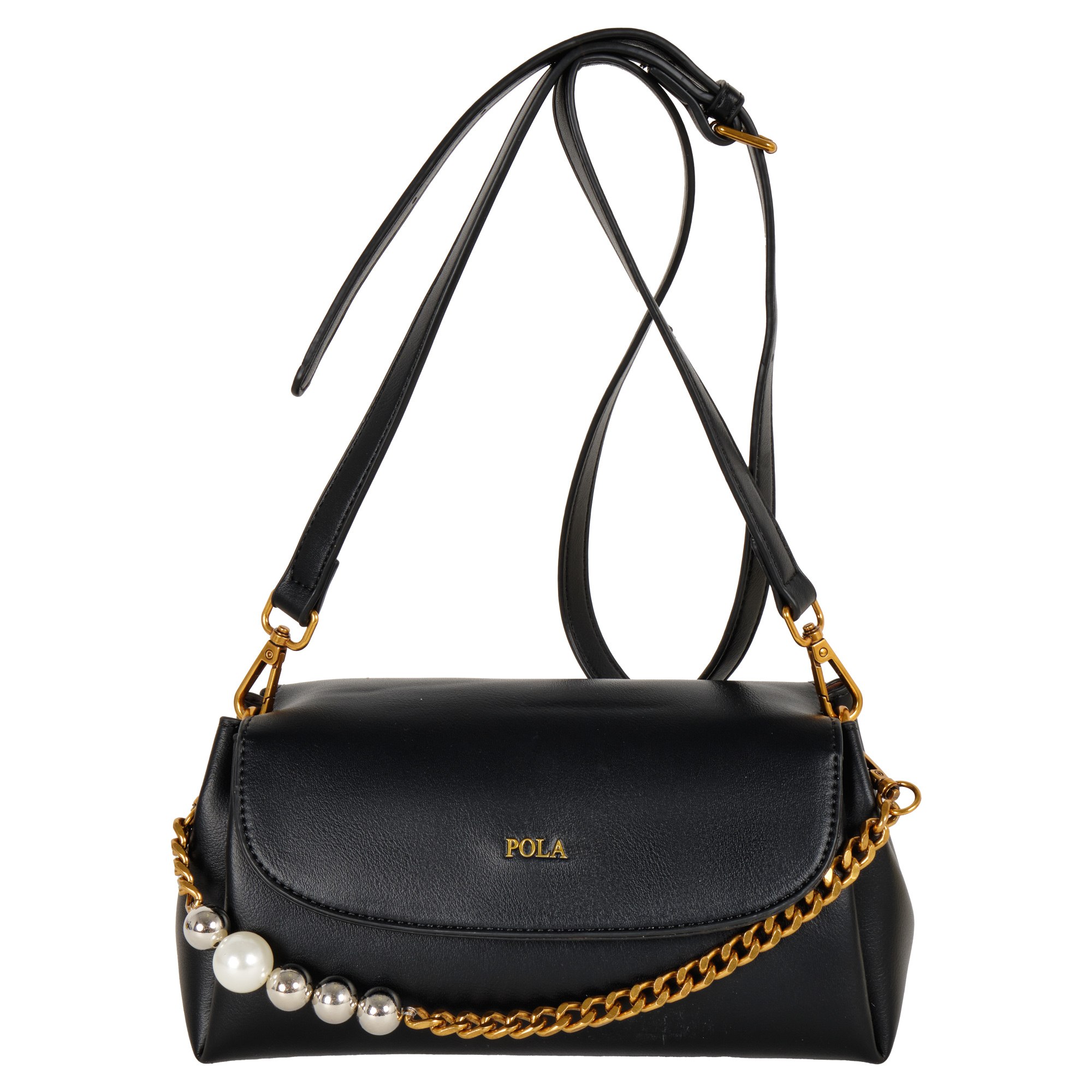 Стильная сумочка Pola выполнена из экокожи. Сумка состоит из одного основного отделения, которое закрывается на магнитную кнопку. Внутри основного отделения кармашек на молнии и два открытых кармана. Данная модель отлично подойдет для повседневного образа. Максимальная длина съемного регулируемого ремня составляет 125 см, высота ручки 15см, которая декорирована крупными бусинами. Цвет фурнитуры-латунь.