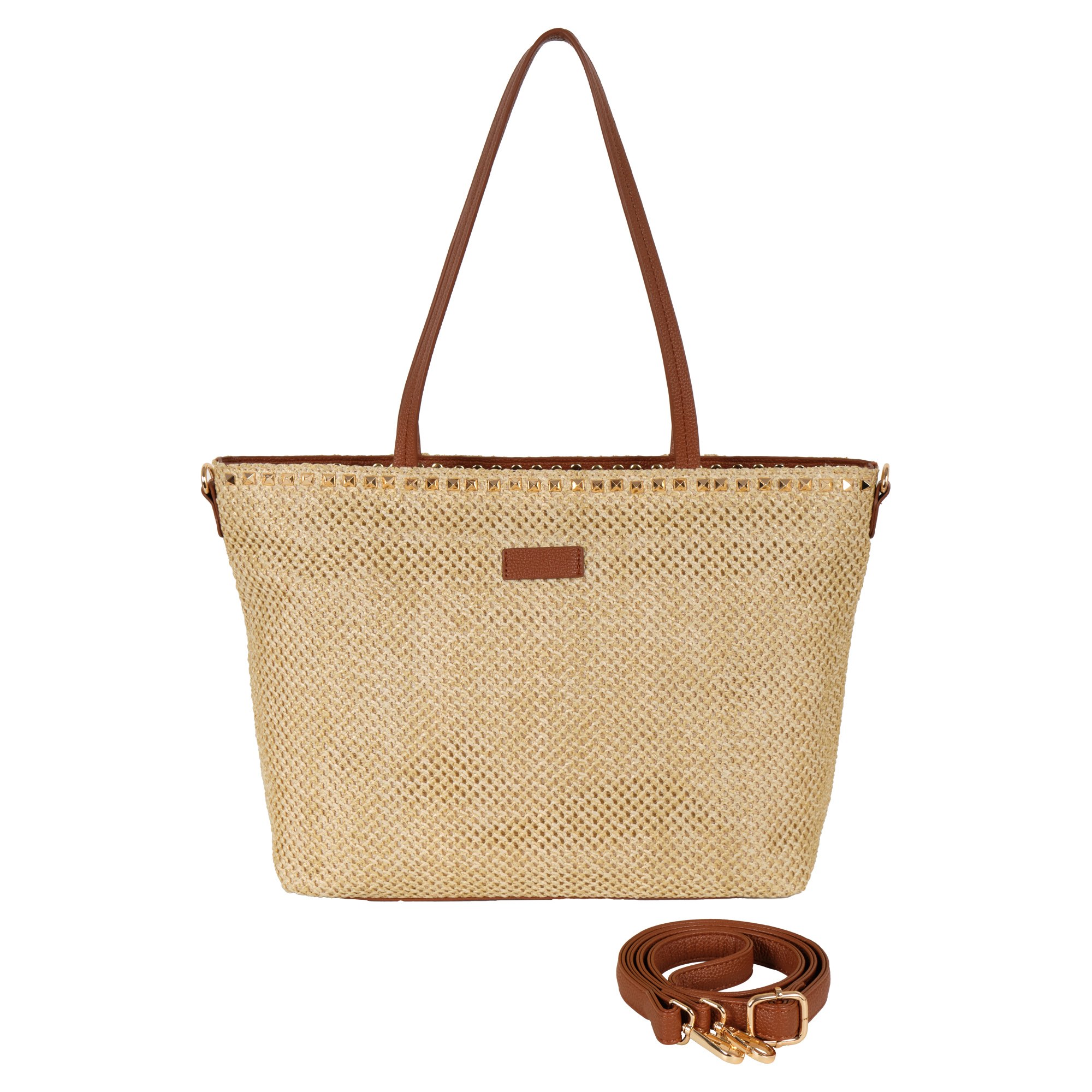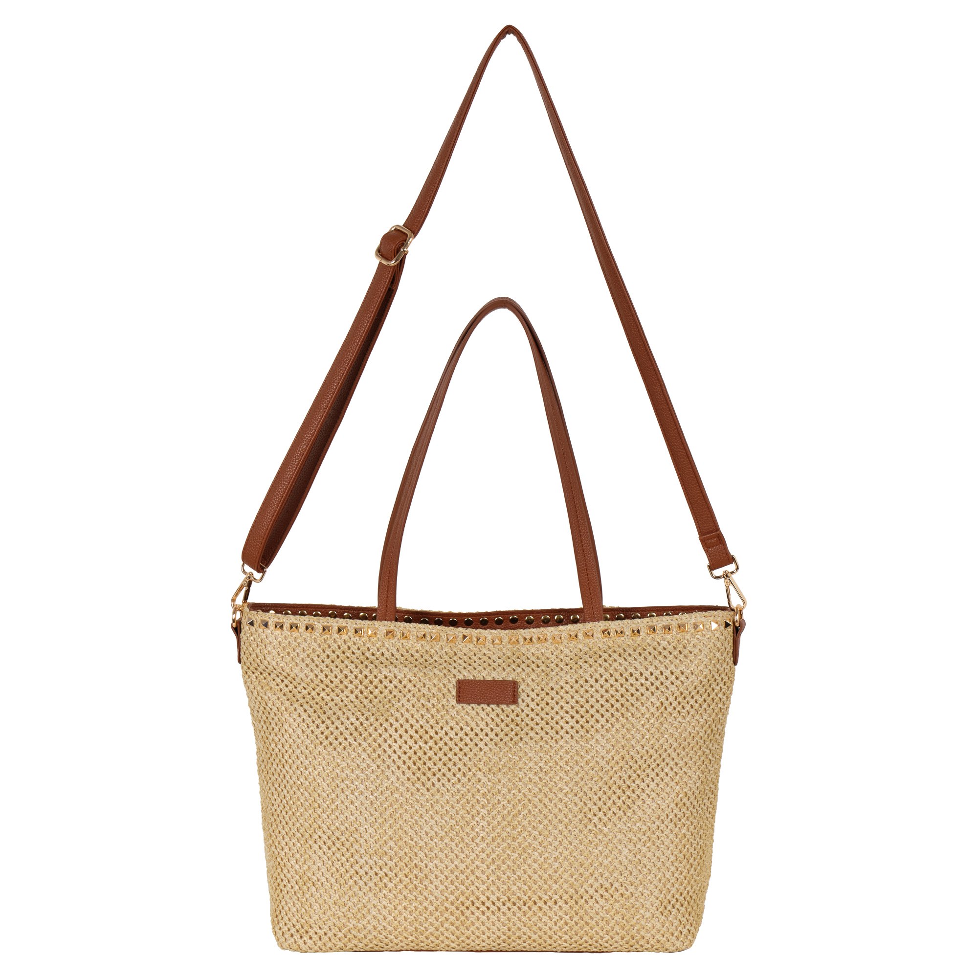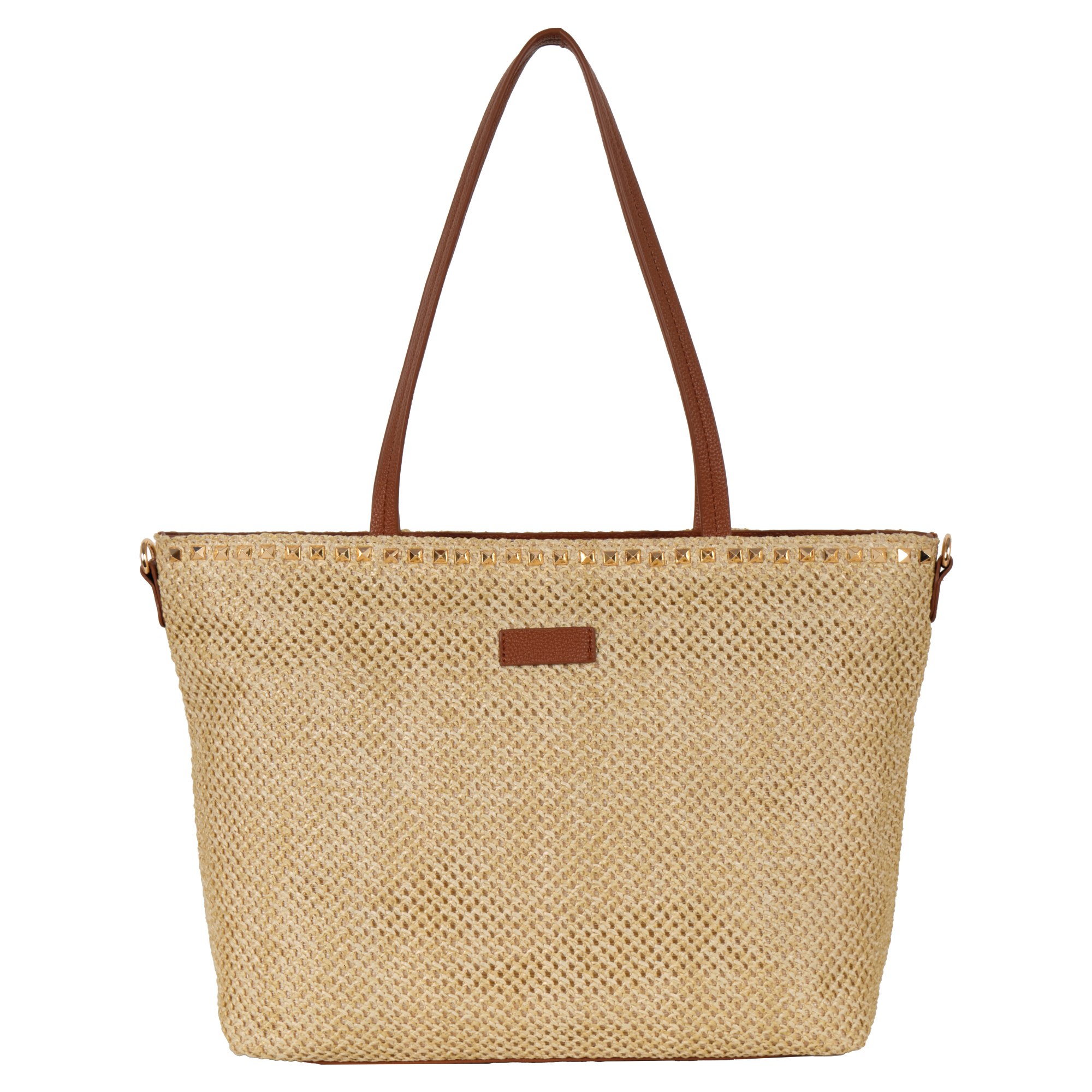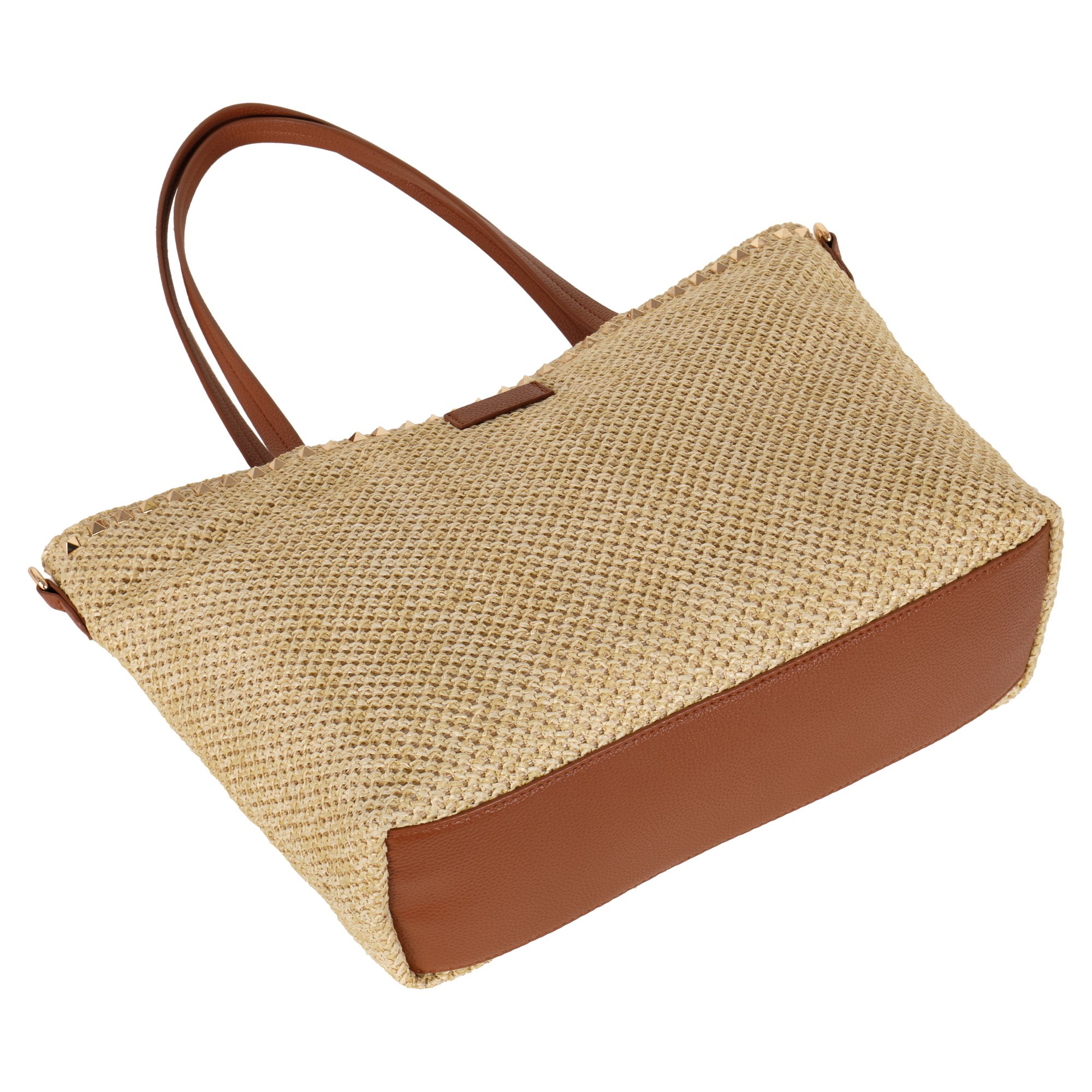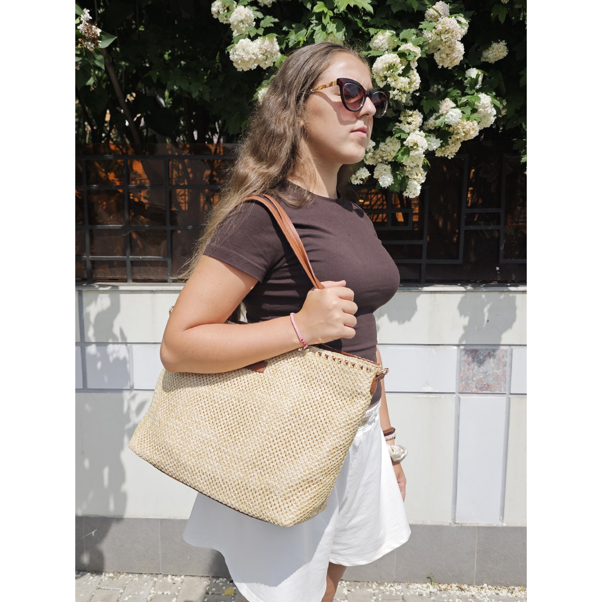 Пляжная сумка фирмы POLA выполнена из искусственного рафия . Cтильный и практичный аксессуар для летнего отдыха. она идеально подходит для поездок на море, прогулок по городу и повседневного использования. Легкая, вместительная. Основное отделение закрывается на молнию. Внутри один карман на молнии и один открытый кармашек. Модель с ручками из кожи на плечо высота 24 см. Длина съемного регулируемого ремня 134см. Цвет фурнитуры-золото.