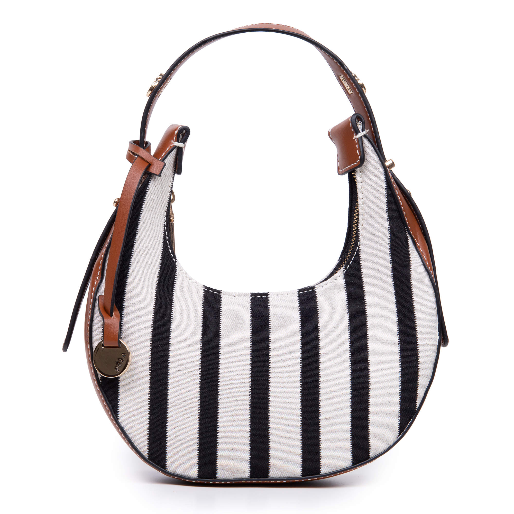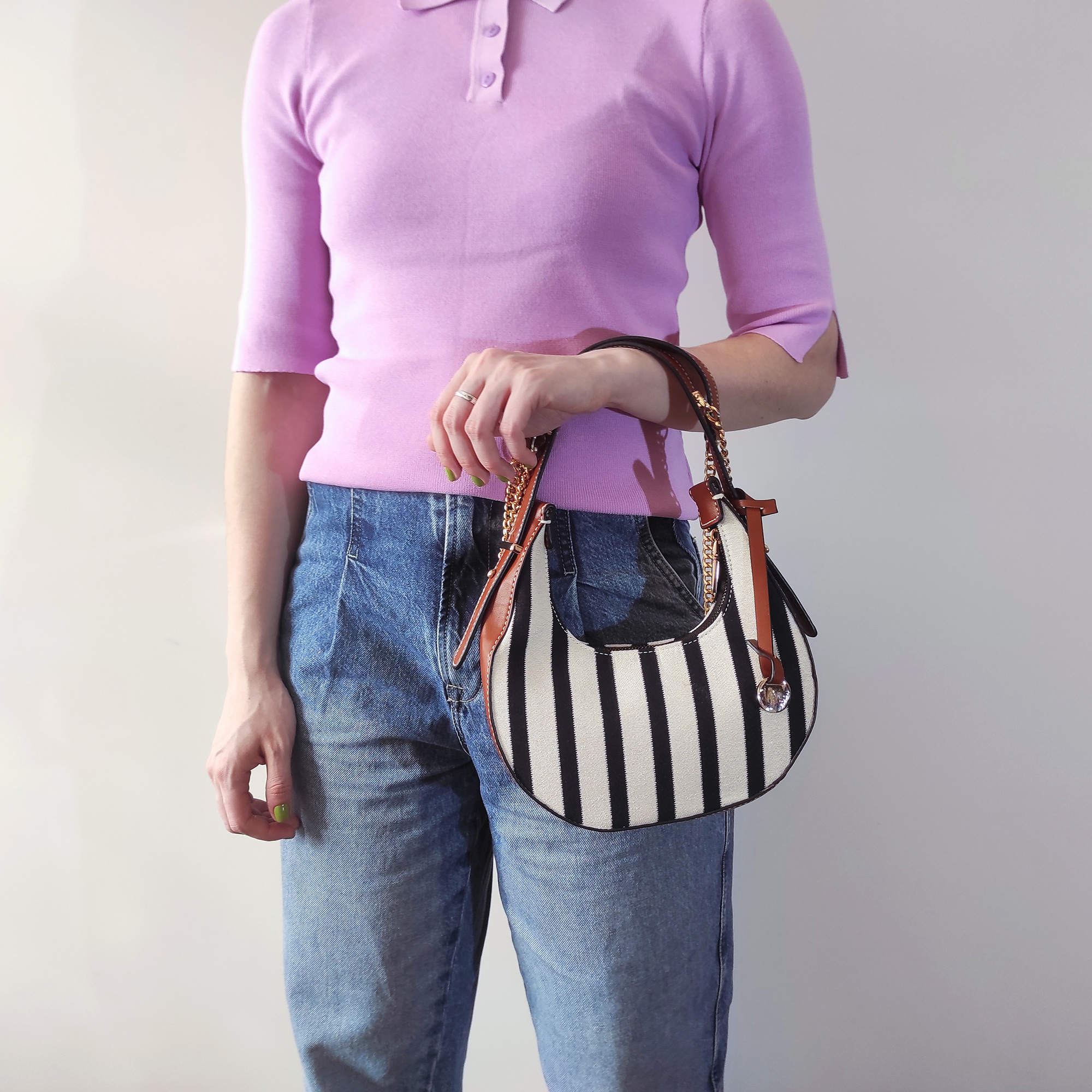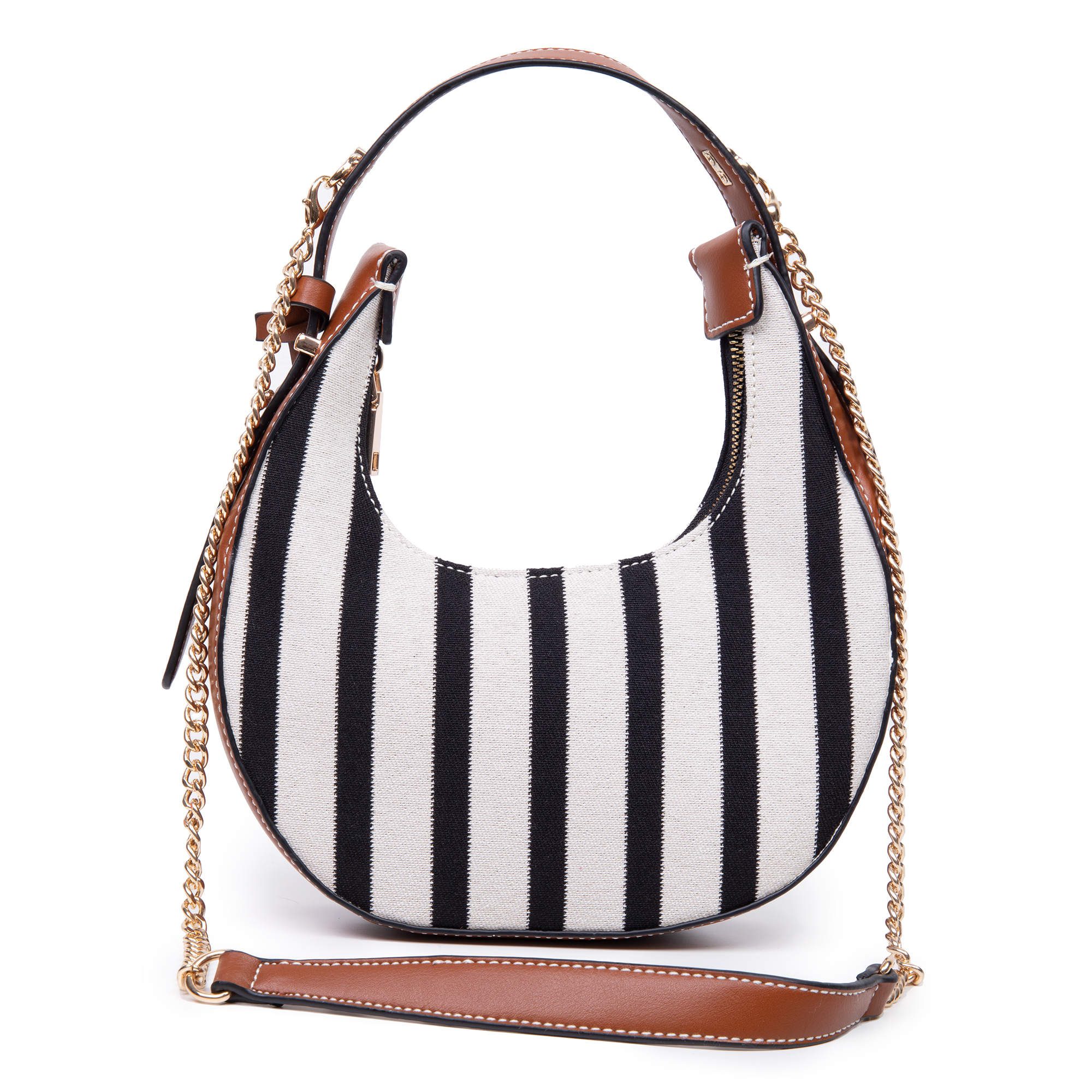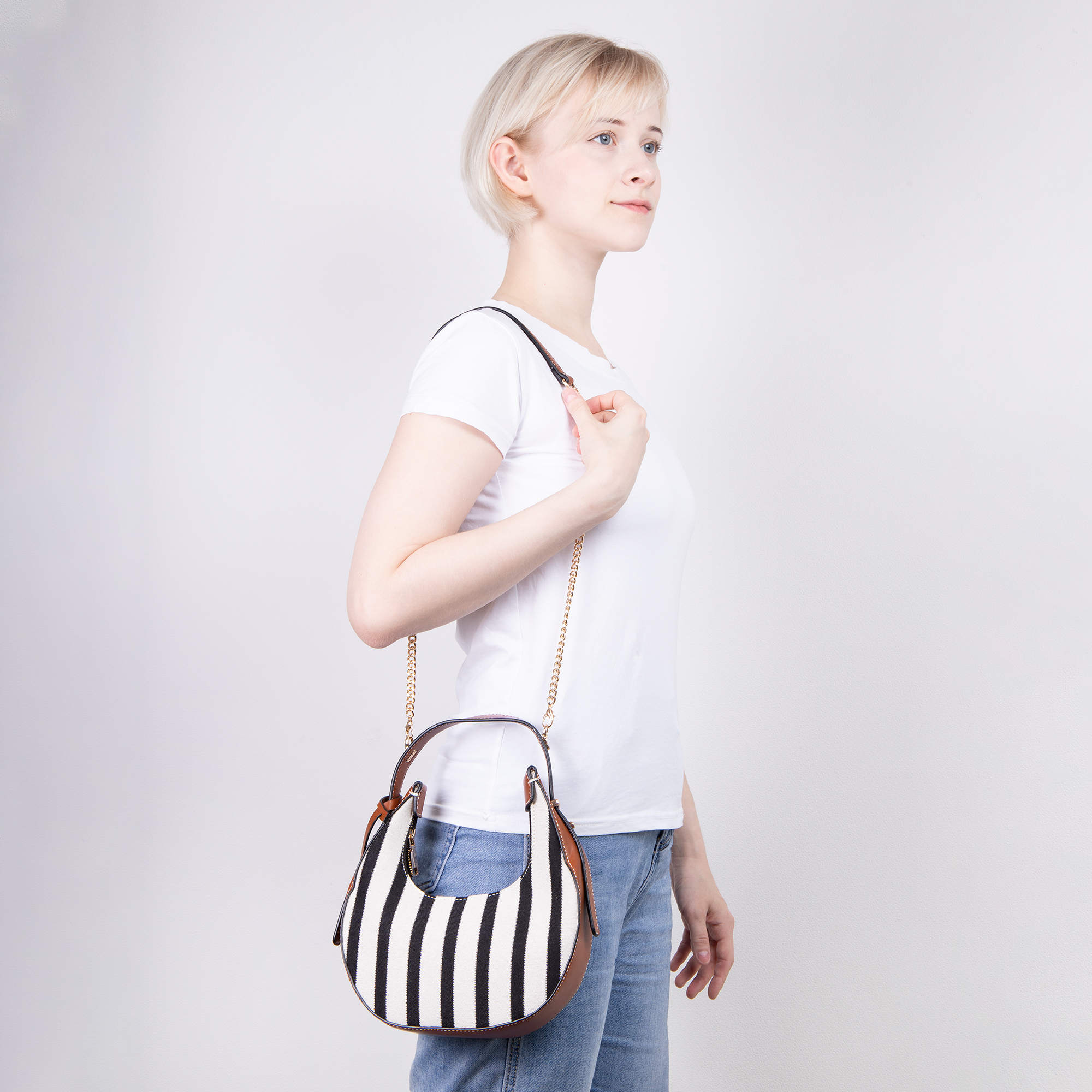 Стильная сумка хобо фирмы POLA – выполнена из полиэстера и экокожи, одна из самых трендовых и востребованных сумочек. Сумка по размеру маленькая, но компактная, подойдёт как для выхода в театр, ресторан, так и для прогулки в будние дни в качестве повседневной сумки в виде полумесяца. Основное отделение закрывается на молнию. Внутри есть один карман на молнии и один открытый кармашек.  У данной модели два варианта переноски, съемная металлическая цепь, очень легкая высота 57см и съемный, регулируемый ремешок из экокожи, высота 24см. Цвет фурнитуры-золото.