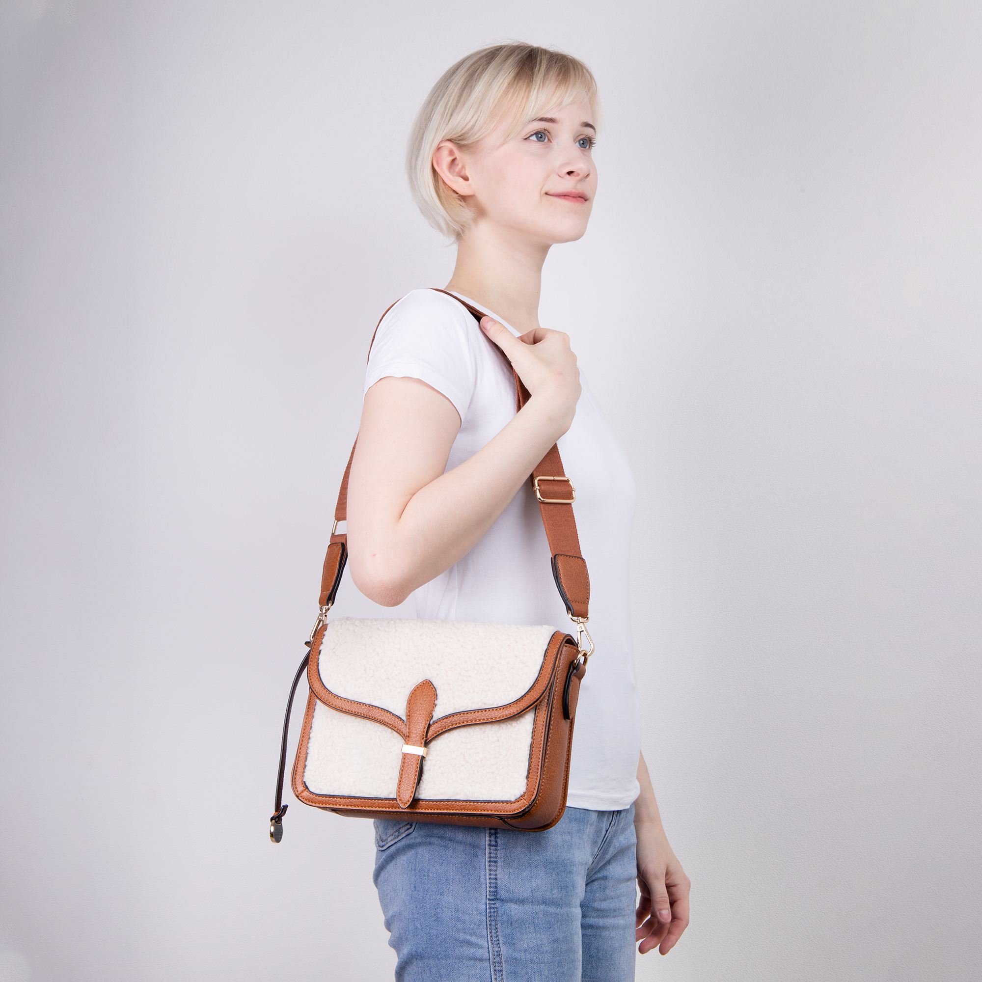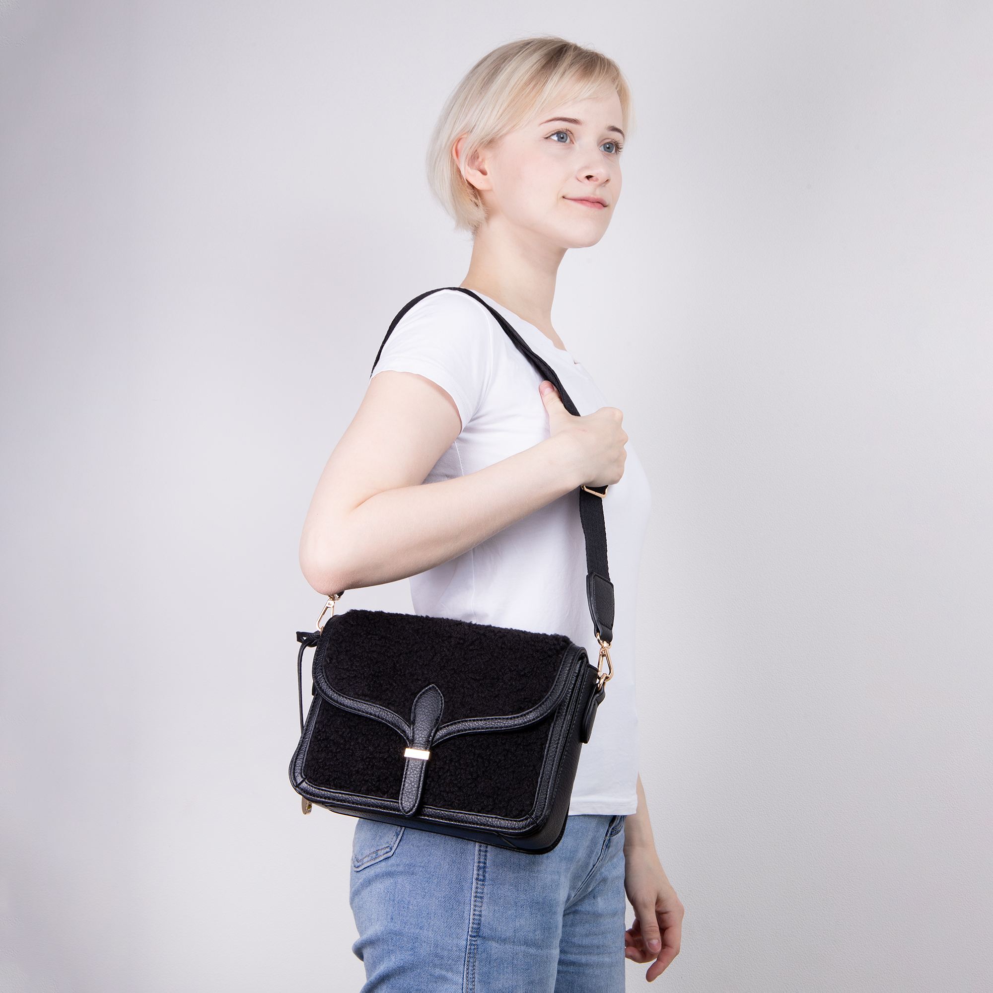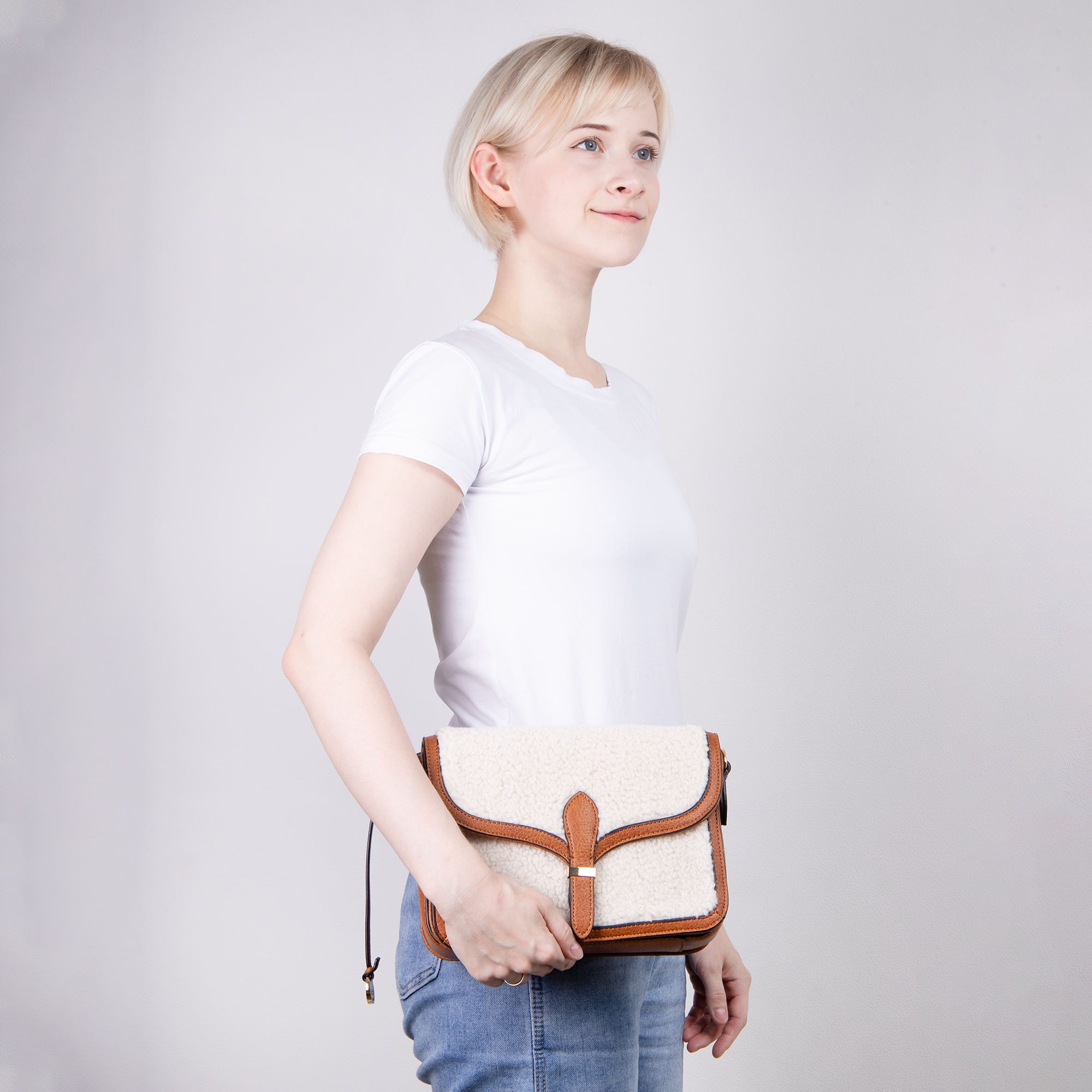 Стильная сумочка Pola выполнена из экокожи и искусственного меха под овчину. Сумки из овчины завоевали сердца абсолютно всех модниц. Основное отделение закрывается на откидной клапан на магнитную кнопку. Внутри три независимых отделения, один карман на молнии и один открытый кармашек, плечевой съемный ремень максимальная длина которого 135 см. Цвет фурнитуры-золото.