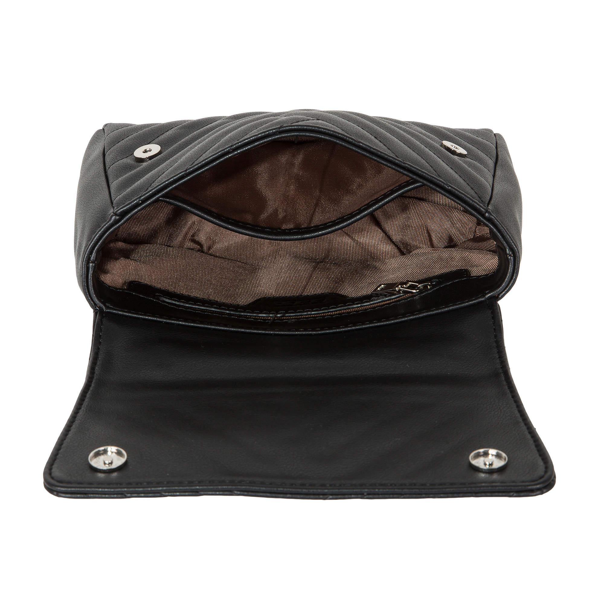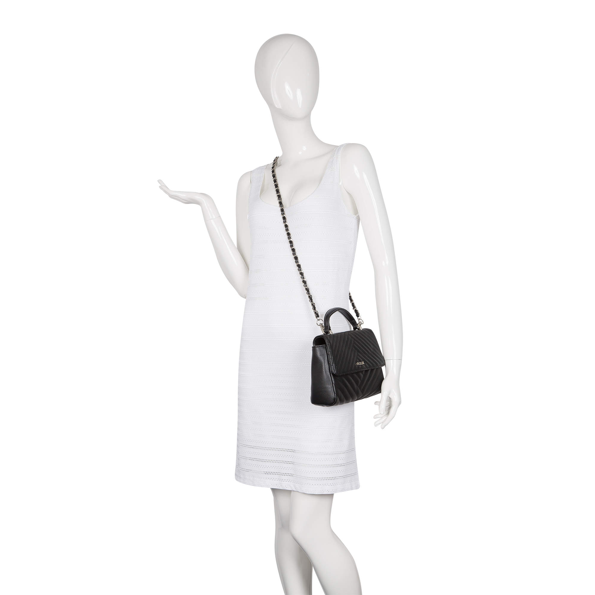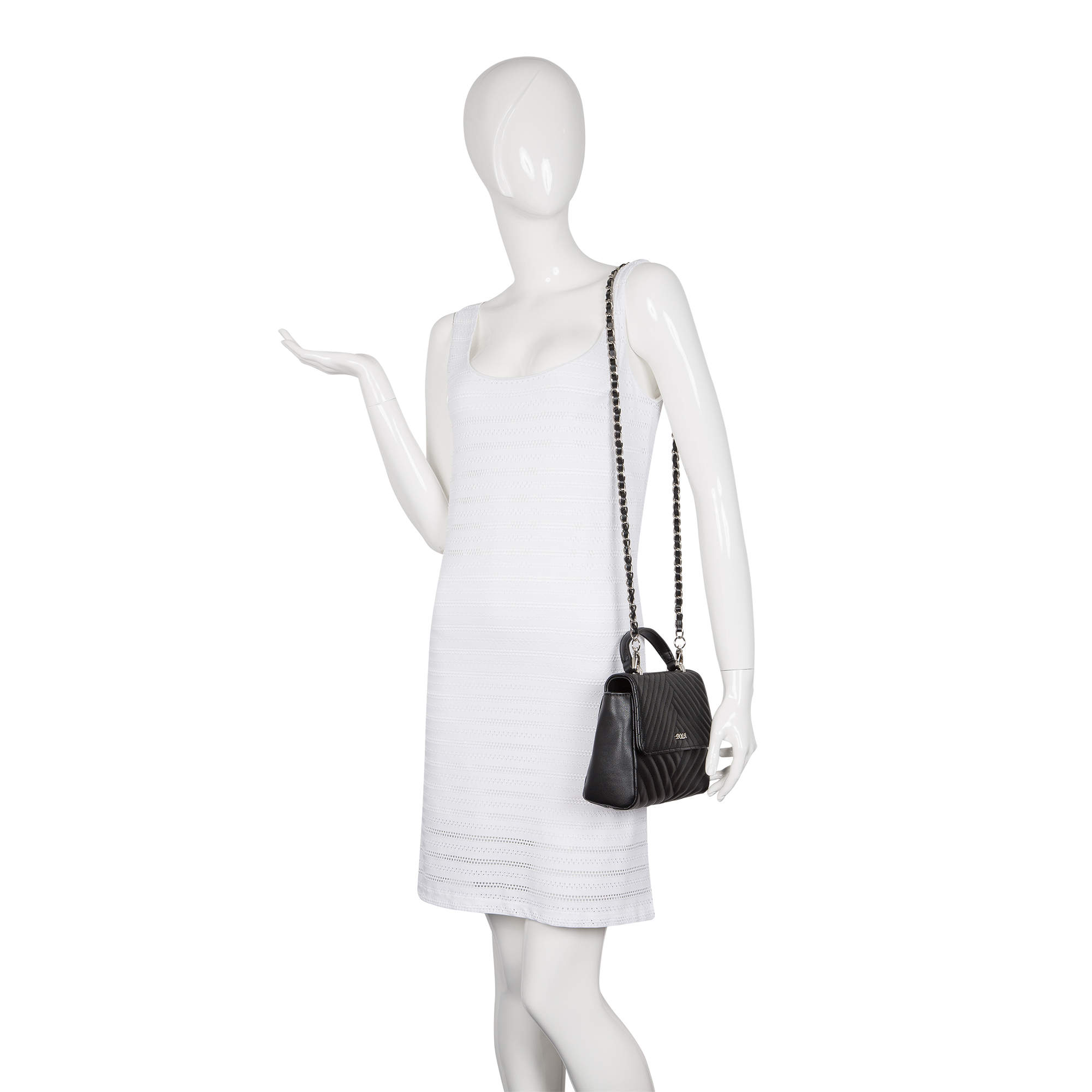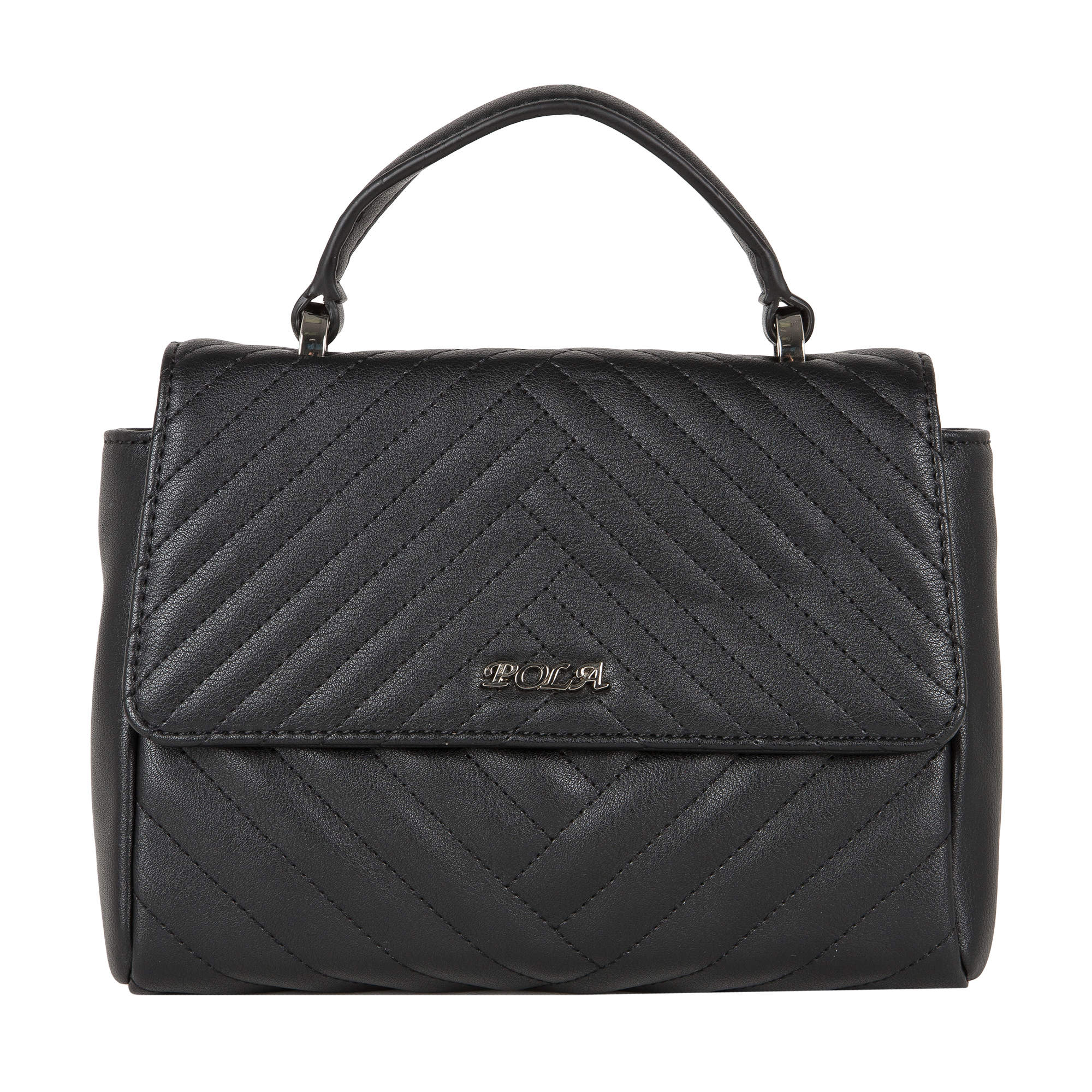 Миниатюрная, изысканная сумочка Pola выполнена из экокожи и по всему периметру украшена декоративной отстрочкой. Сумка состоит из одного основного отделения, которое закрывается клапаном на две магнитные кнопки, внутри основного отделения есть кармашек на молнии и открытый карман. Данную модель можно носить, как в руках, так и на плече - с помощью съёмного ремня-цепочки, максимальная длина которого составляет 110см.