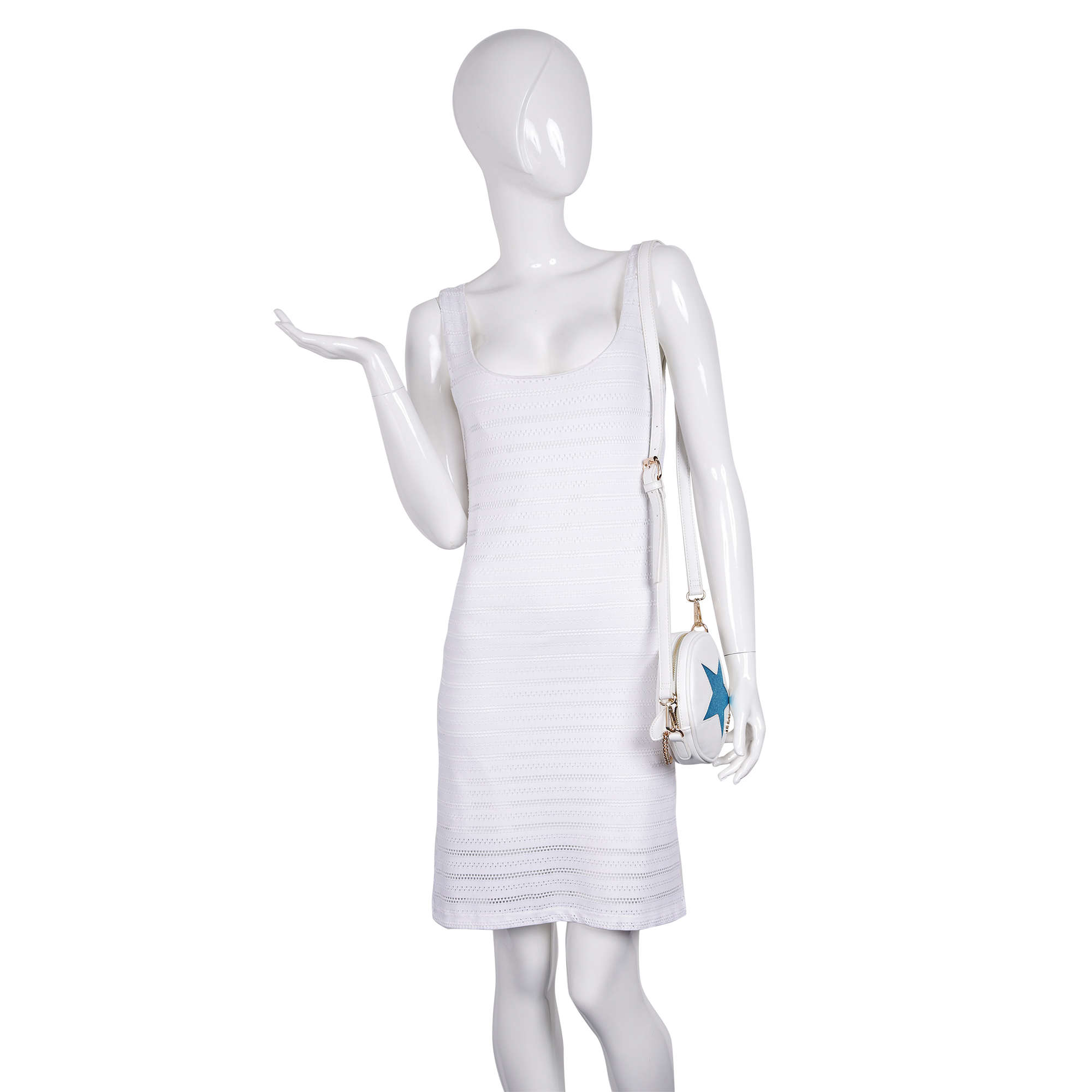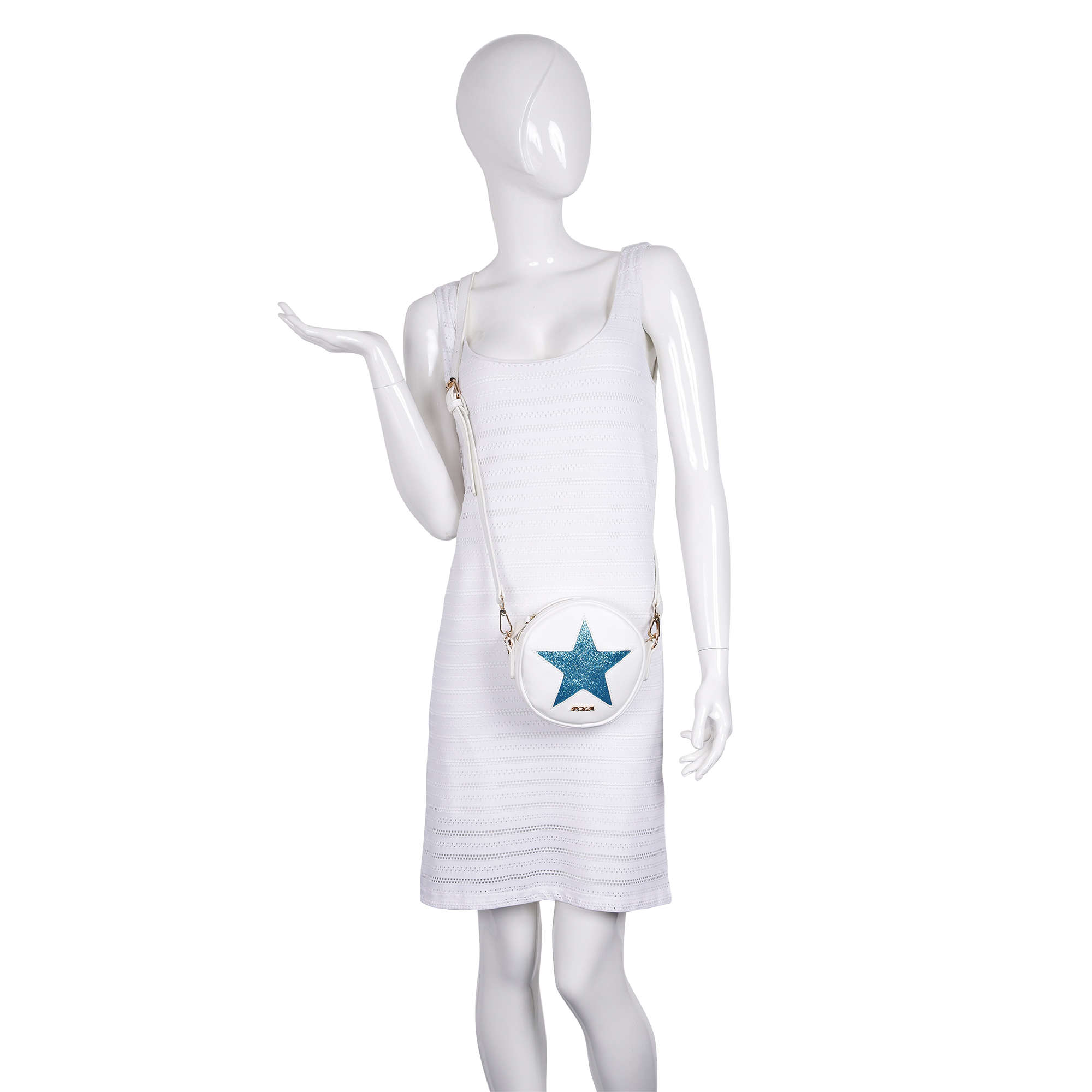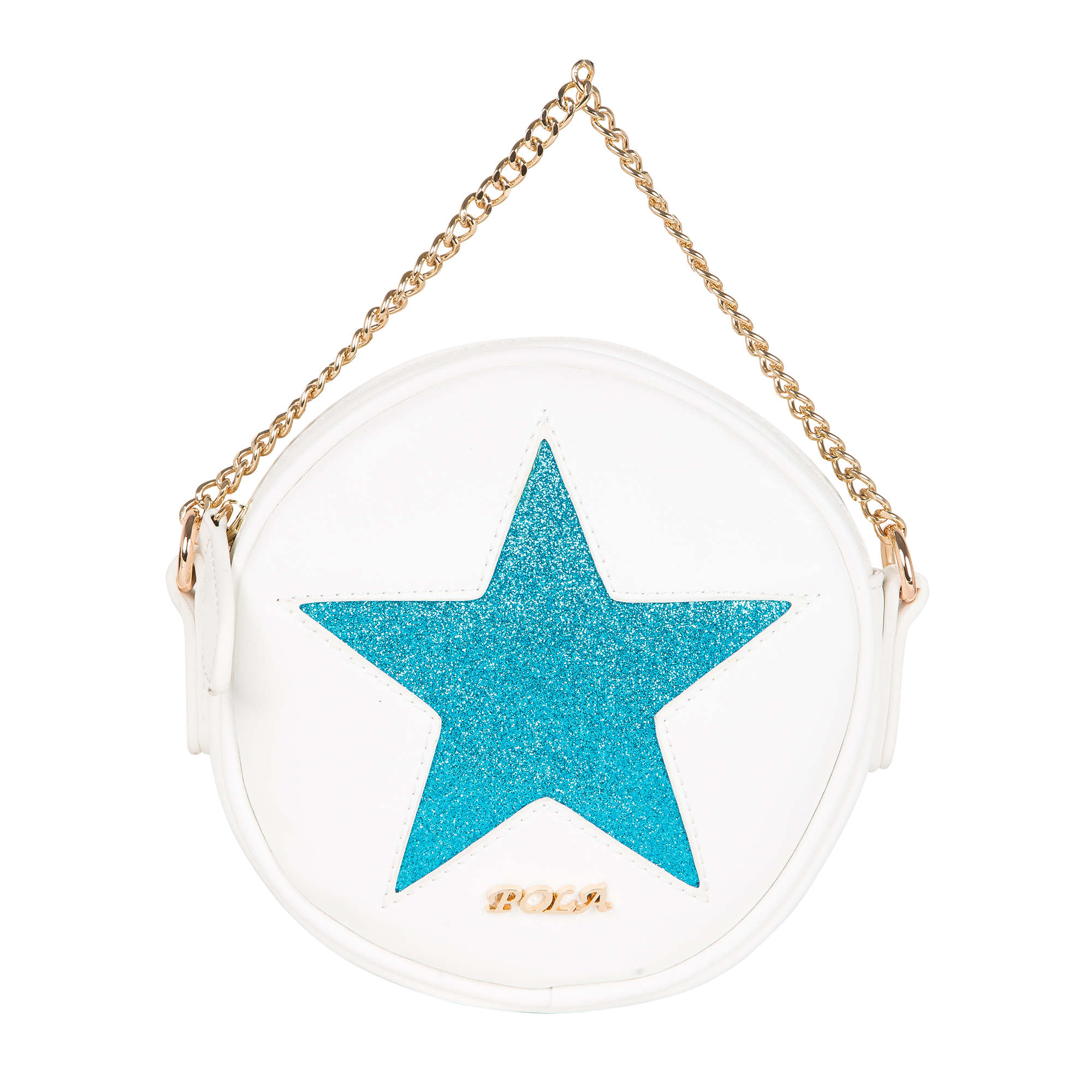 Ультрамодная, миниатюрная сумка абсолютно круглой формы Pola выполнена из экокожи и великолепно подходит как для создания вечернего образа, так и и для повседневного использования модницами. Данная модель по центру декорирована крупной яркой звездой различной цветовой гаммы. Сумочка закрывается на металлическую молнию. Особую изысканность данной сумке придаёт ручка- цепочка, в комплект входит съёмный регулируемый ремень, длина которого составляет 116 см. Цвет фурнитуры-золото.