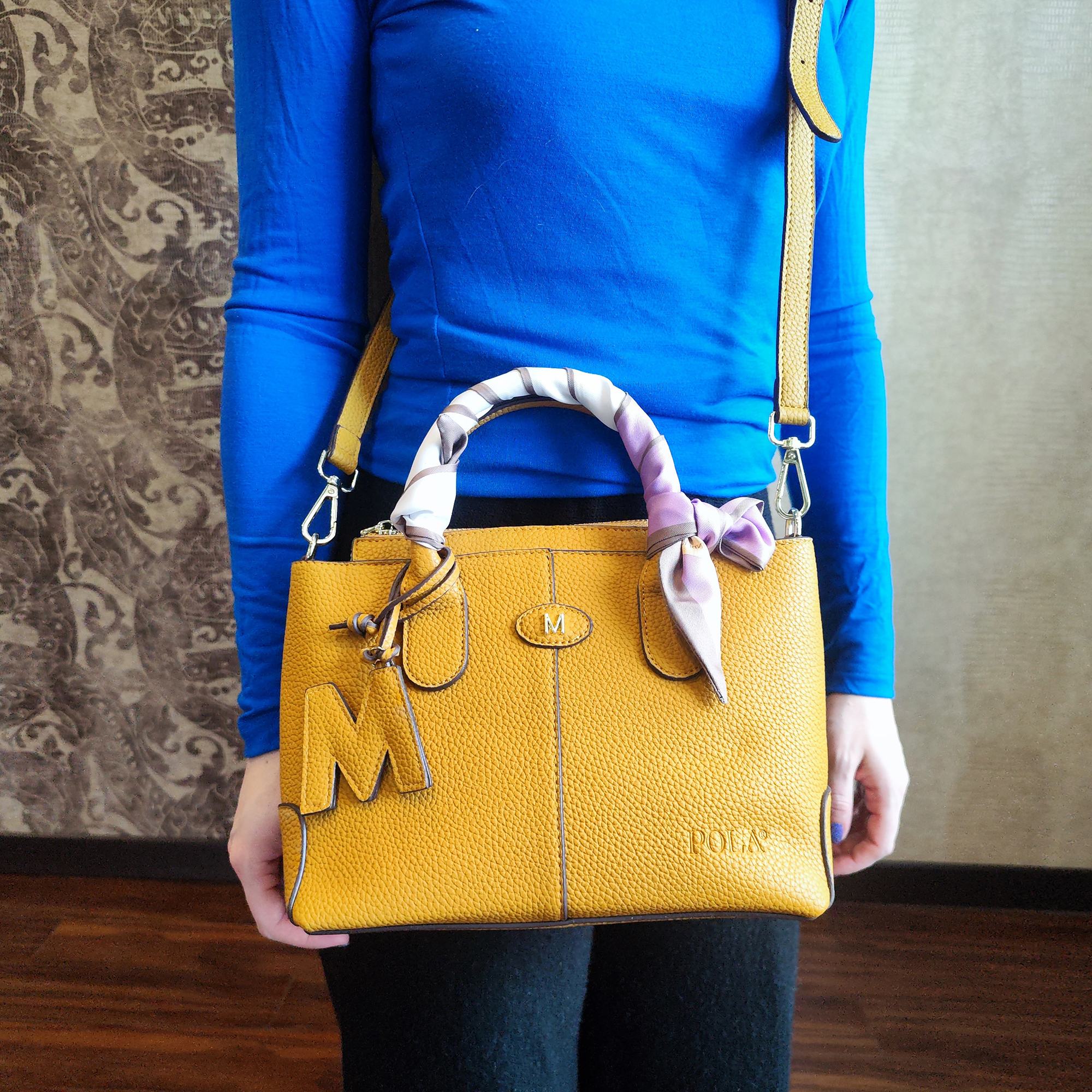 Стильная женская сумка фирмы Pola выполнена из экокожи и украшена брелоком. Основное отделение закрывается на металлическую молнию. Внутри сумочки есть маленький карман на молнии и два открытых. Сумка прекрасно подойдёт для повседневной носки. У сумки есть ручки для переноски, высота которых составляет 10 см их можно украсить платком и два съёмных, ремешка, один из экокожи тонкий регулируемый длина которого- 121 см и 87 см второй ремешок из текстиля. Цвет фурнитуры-золото.