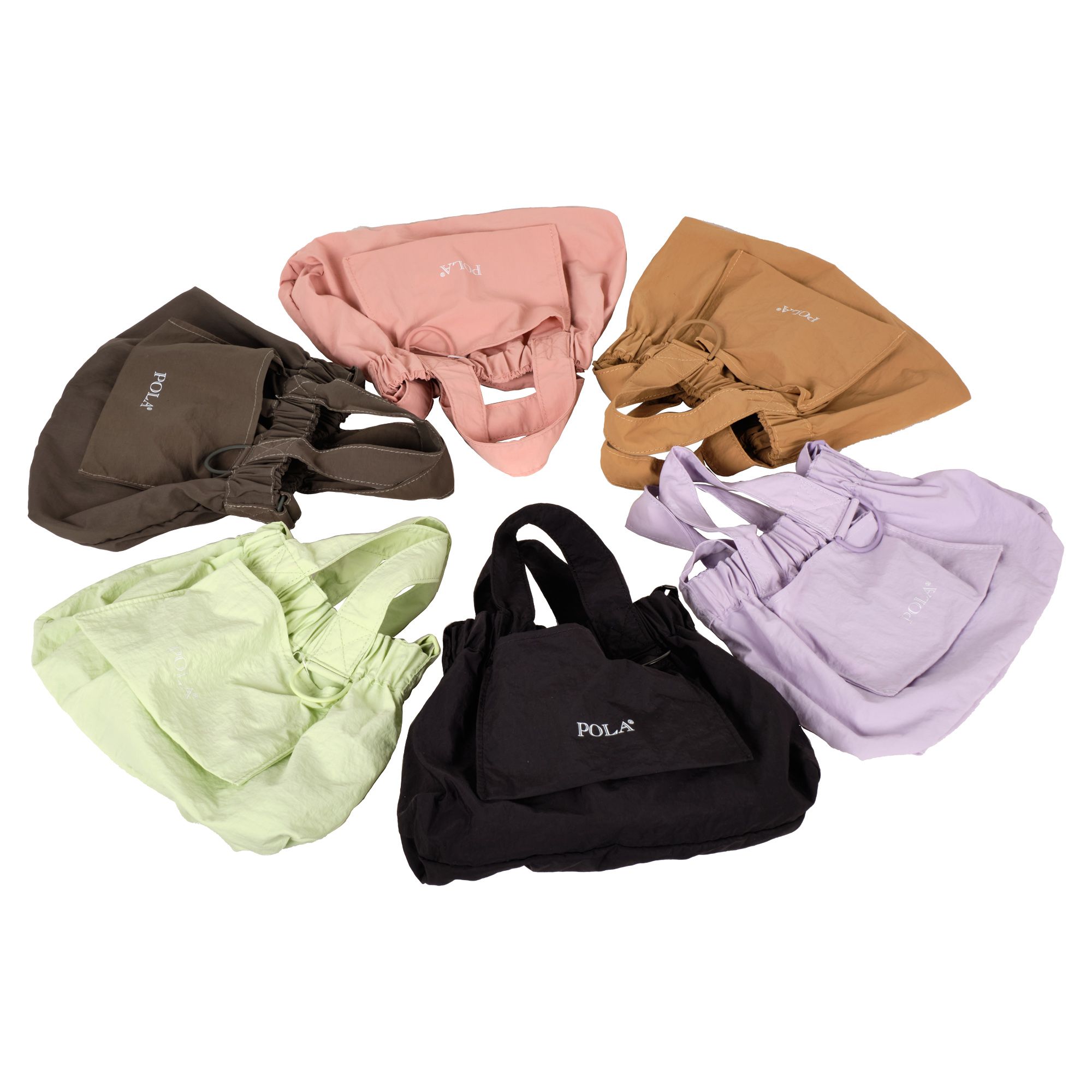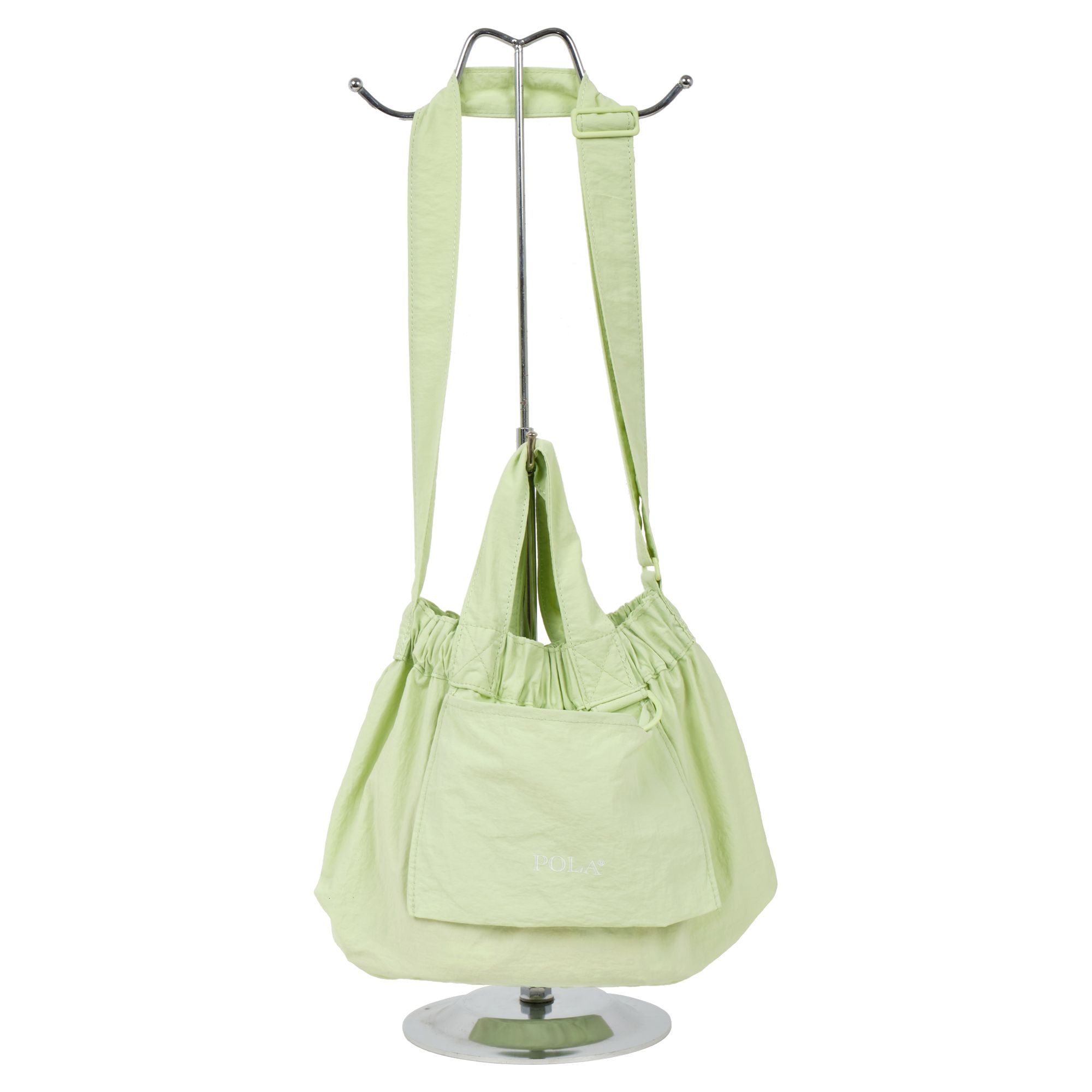 Сумка-шоппер фирмы  POLA выполнена из текстиля. Основное отделение закрывается на металлическую кнопку. Внутри одно отделение. Спереди маленький карман для мелочей. Длина ручек 14 см. Сумку можно носить на плече за счет регулируемого ремня.